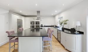 To the rear, the accommodation opens into a superb kitchen/family room extending to over nine metres, designed for modern family living with ample space for seating and dining. The kitchen is fitted with a stunning Neptune kitchen, finished to an outstanding standard, featuring a substantial central island with additional storage, black honed granite work surfaces throughout, a five-ring gas hob, integrated appliances including two single ovens, a steam oven and a microwave, an integrated dishwasher, a wine cooler, and space for an American-style fridge/freezer.