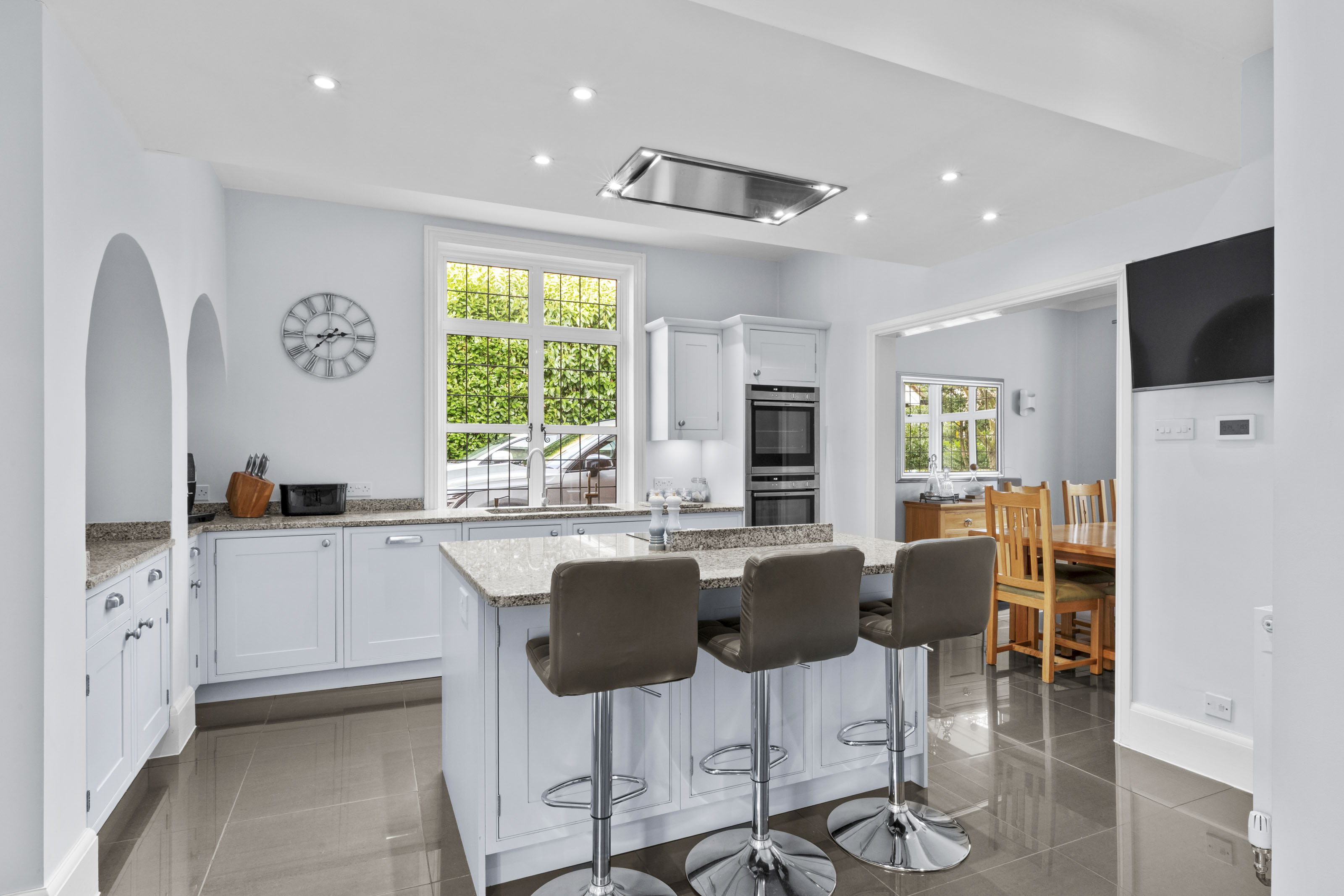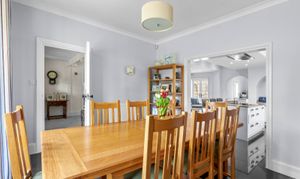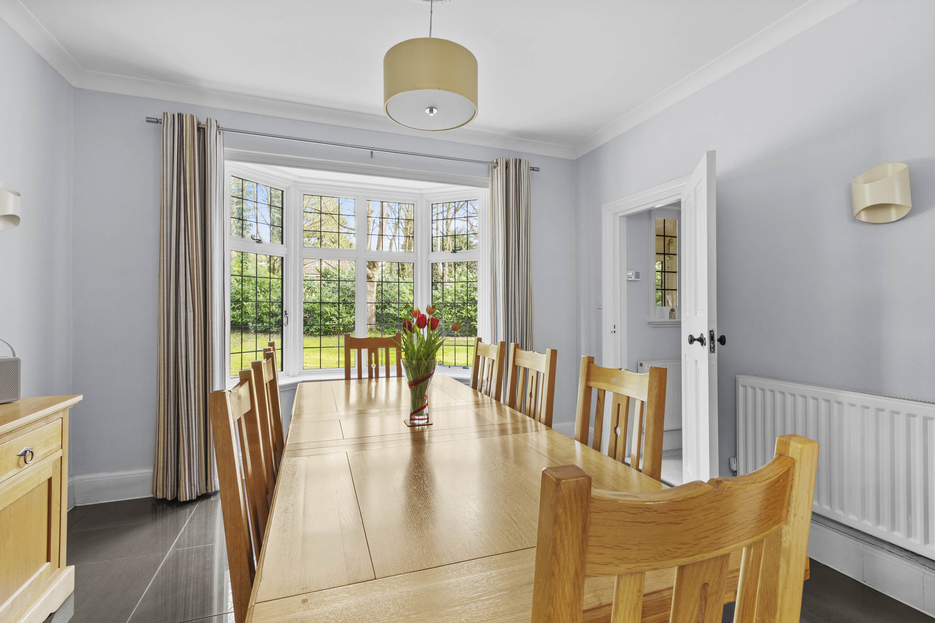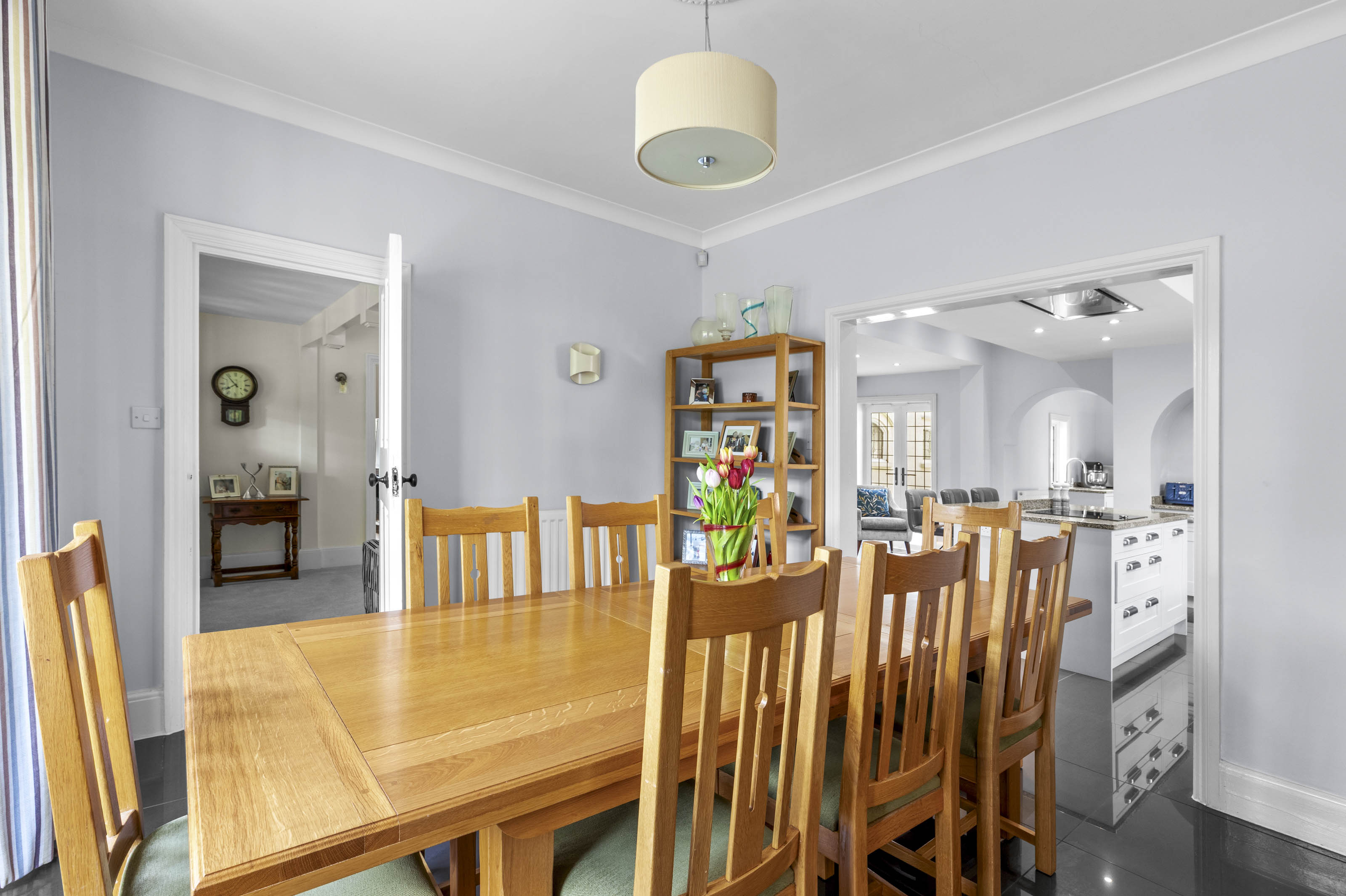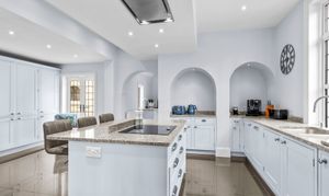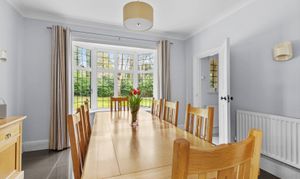 The kitchen/breakfast room is a great space, well-appointed and comprehensively fitted, incorporating a large central island along with integrated appliances; for entertaining this connects perfectly with the dining room, which also has a deep bay window. Beyond the kitchen is the fitted scullery or secondary kitchen area, with a door to the rear hall and onto the utility room.
