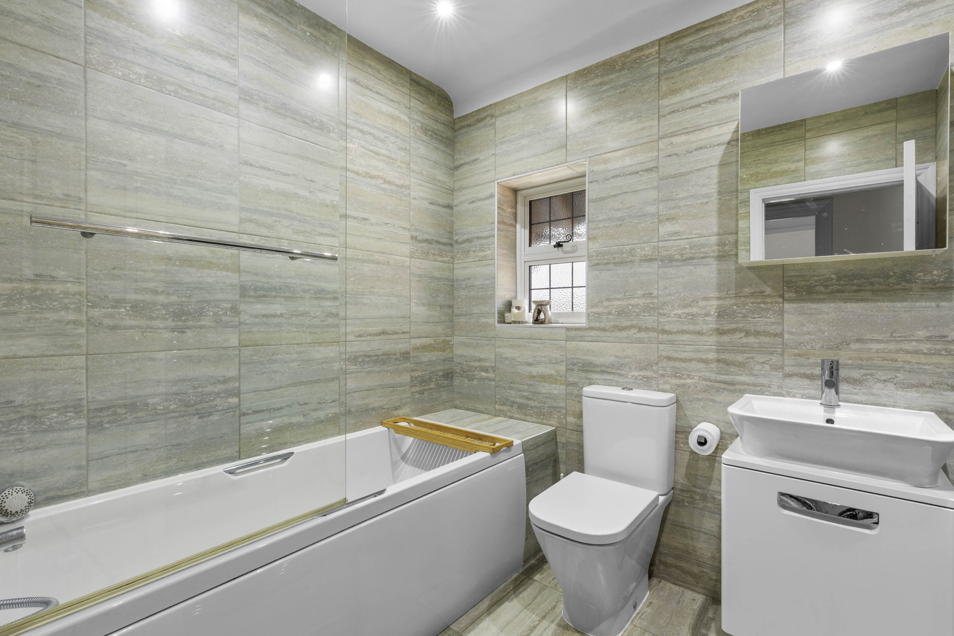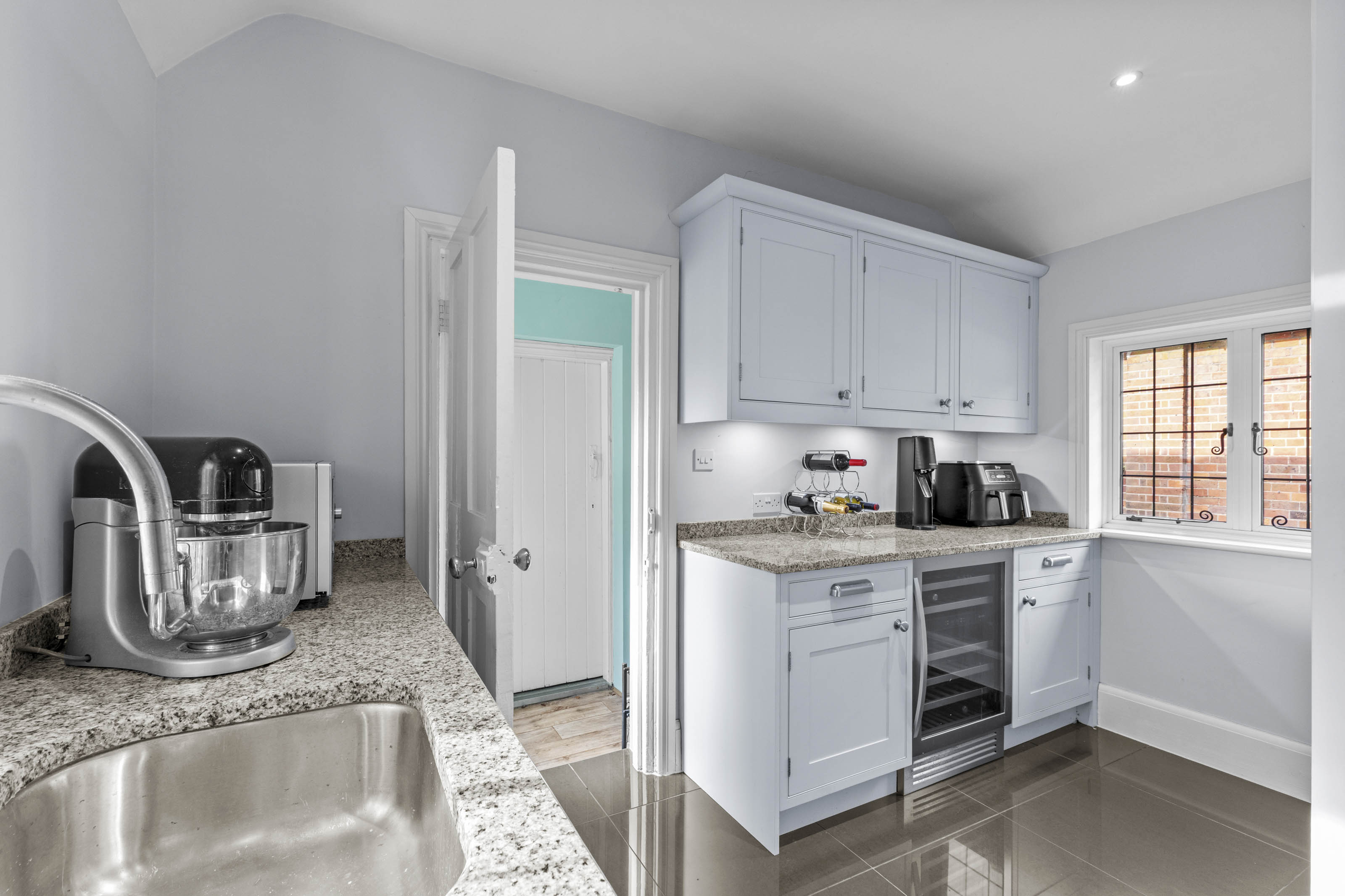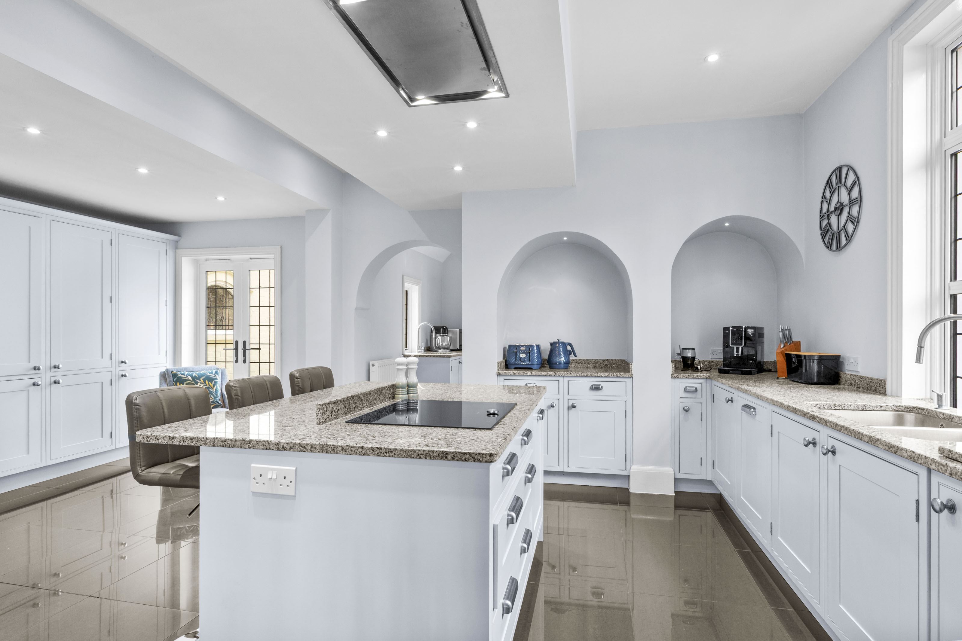 The kitchen/breakfast room is a great space, well-appointed and comprehensively fitted, incorporating a large central island along with integrated appliances; for entertaining this connects perfectly with the dining room, which also has a deep bay window. Beyond the kitchen is the fitted scullery or secondary kitchen area, with a door to the rear hall and onto the utility room.