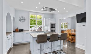 The entrance porch gives access to the impressive reception hall with turning staircase and galleried landing. The dual aspect family room to the front has a bay window and original fireplace. The majestic sitting room is a great size with a deep box bay and impressive fireplace with wood burner. The garden room enjoys a lovely outlook and doors out to the terrace.