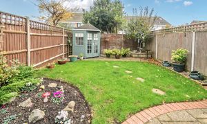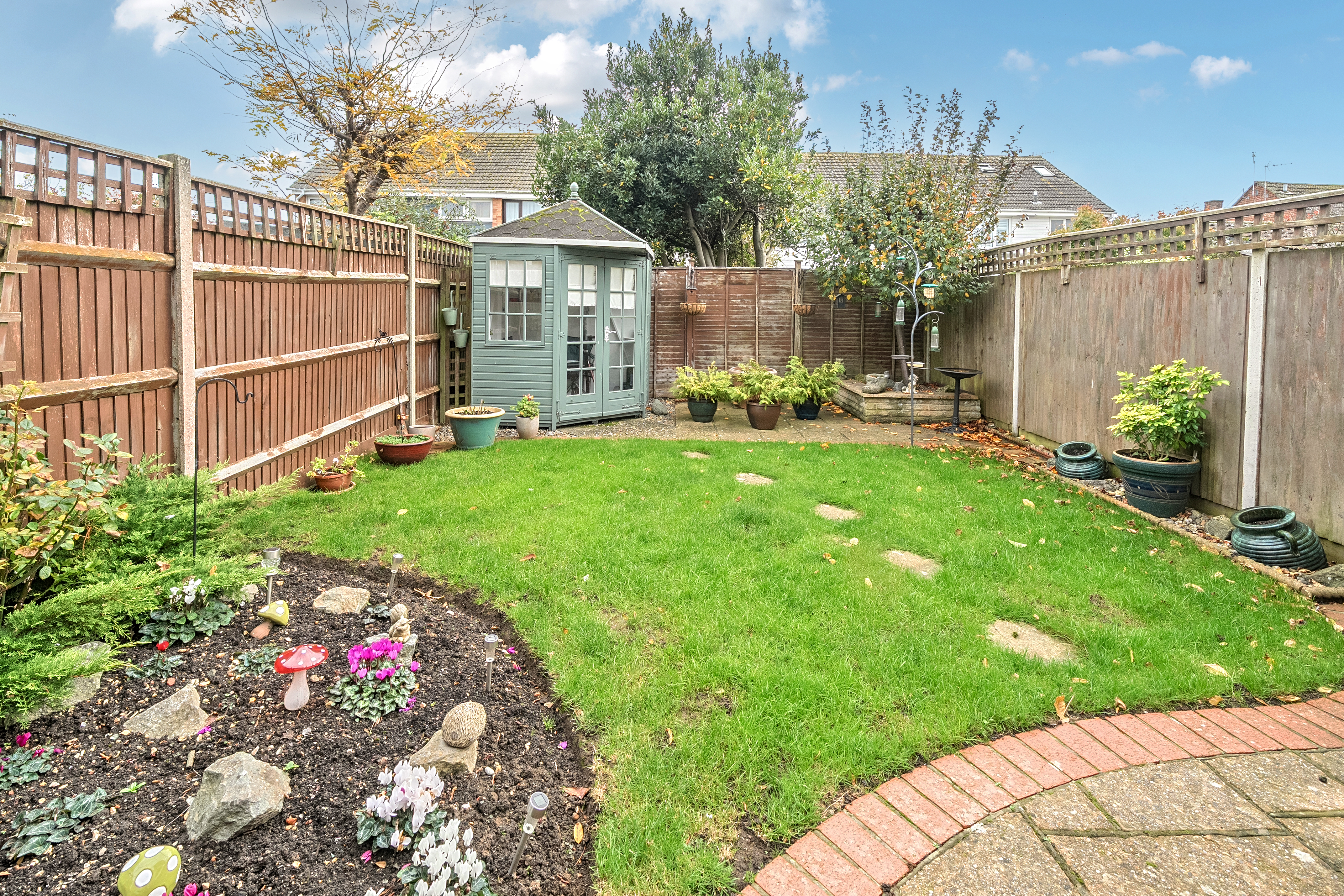 Outside, the rear garden has been designed for low maintenance, featuring a lawned area and a summer shed. To the front, there is a private garden as well as a communal lawn area offering pleasant views.