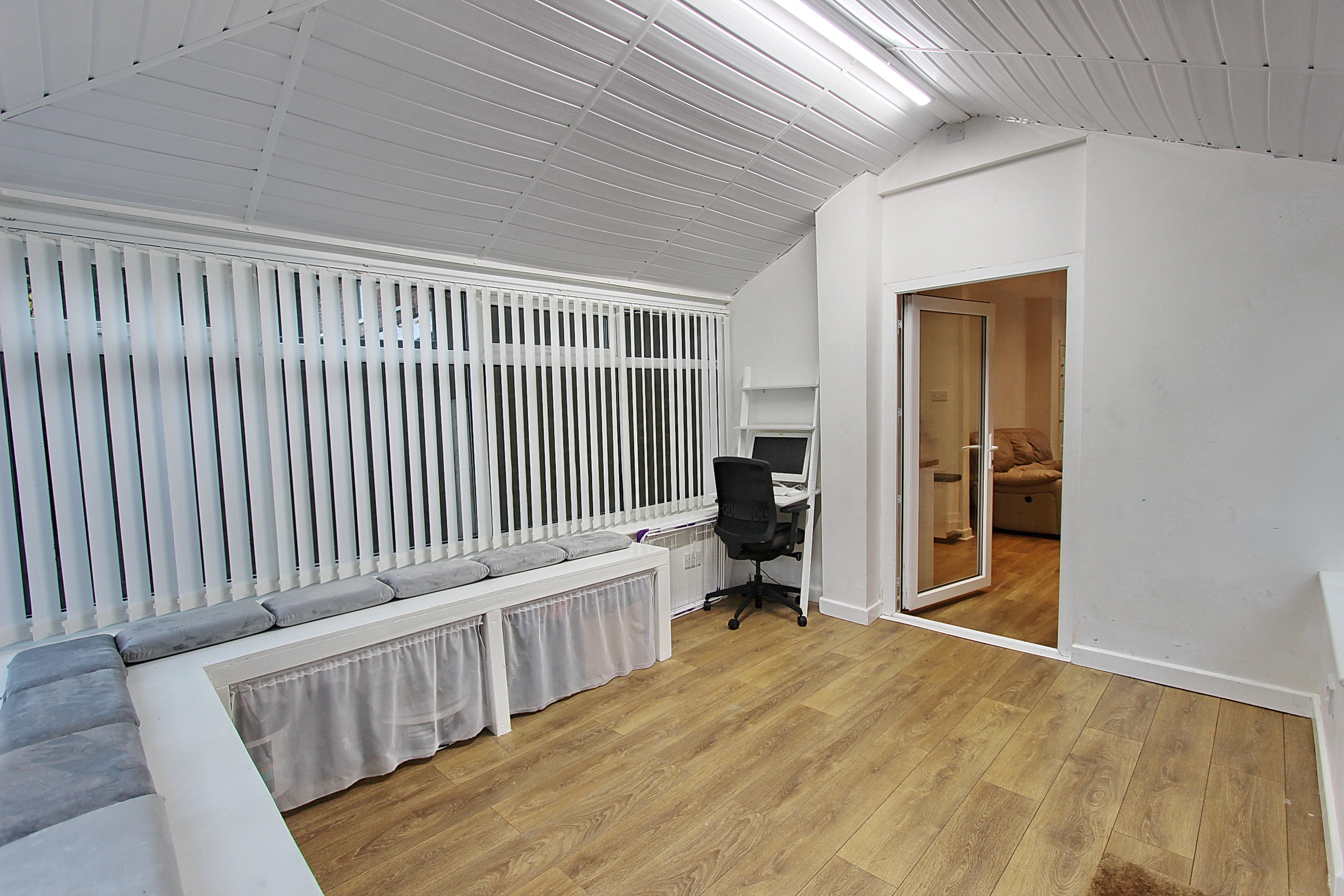 The entrance vestibule is complemented with a laminate floor. The spacious lounge/dining room is tastefully decorated with ample room for sofas and further furniture and laminate flooring. This is open plan to the kitchen which is modern fitted with wall/base units and work surfaces, integrated double oven/grill, hob, integrated fridge/freezer, dishwasher and washing machine, laminate flooring. There is door access into the conservatory which is ideal to use as a TV room or family/play room with French patio doors onto the garden.