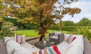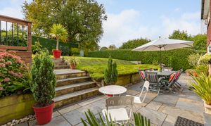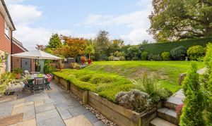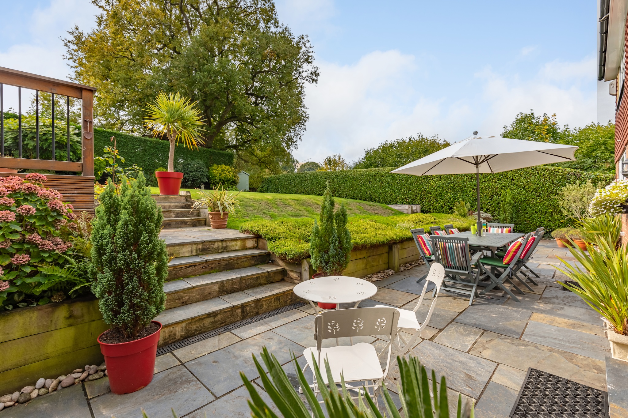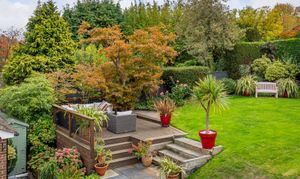 - South-facing rear garden with large patio, raised deck, and mature planting offering excellent privacy
