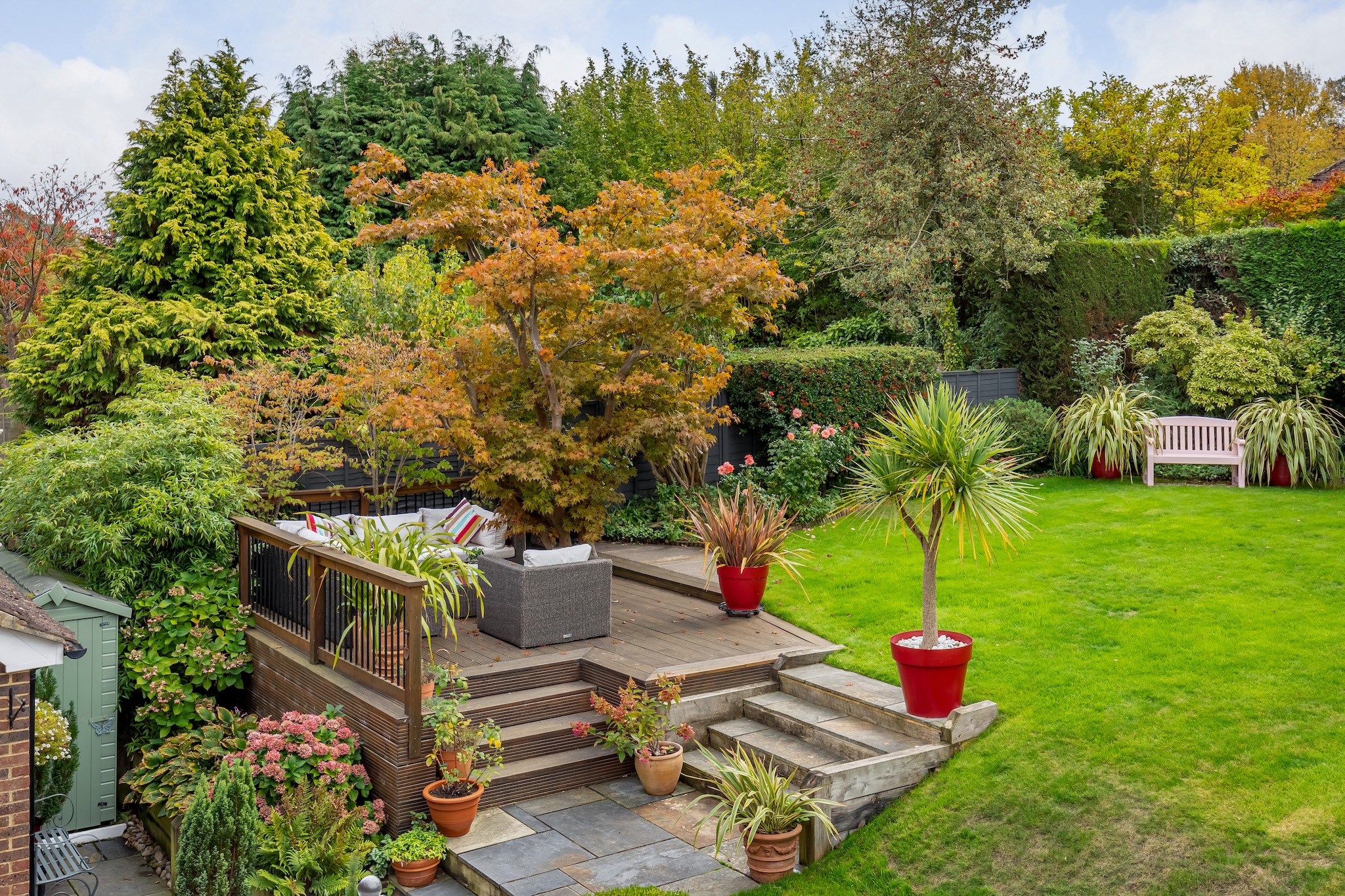 The property enjoys a wonderful south-facing garden, bathed in sunshine throughout the day. A spacious stone patio runs along the back of the house, perfect for outdoor dining and entertaining, while steps lead to a raised deck that wraps around a striking mature acer tree — an idyllic spot to sit and enjoy views across the garden. Beyond lies a generous lawned area, bordered by well-established planting that provides excellent privacy and year-round interest.