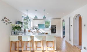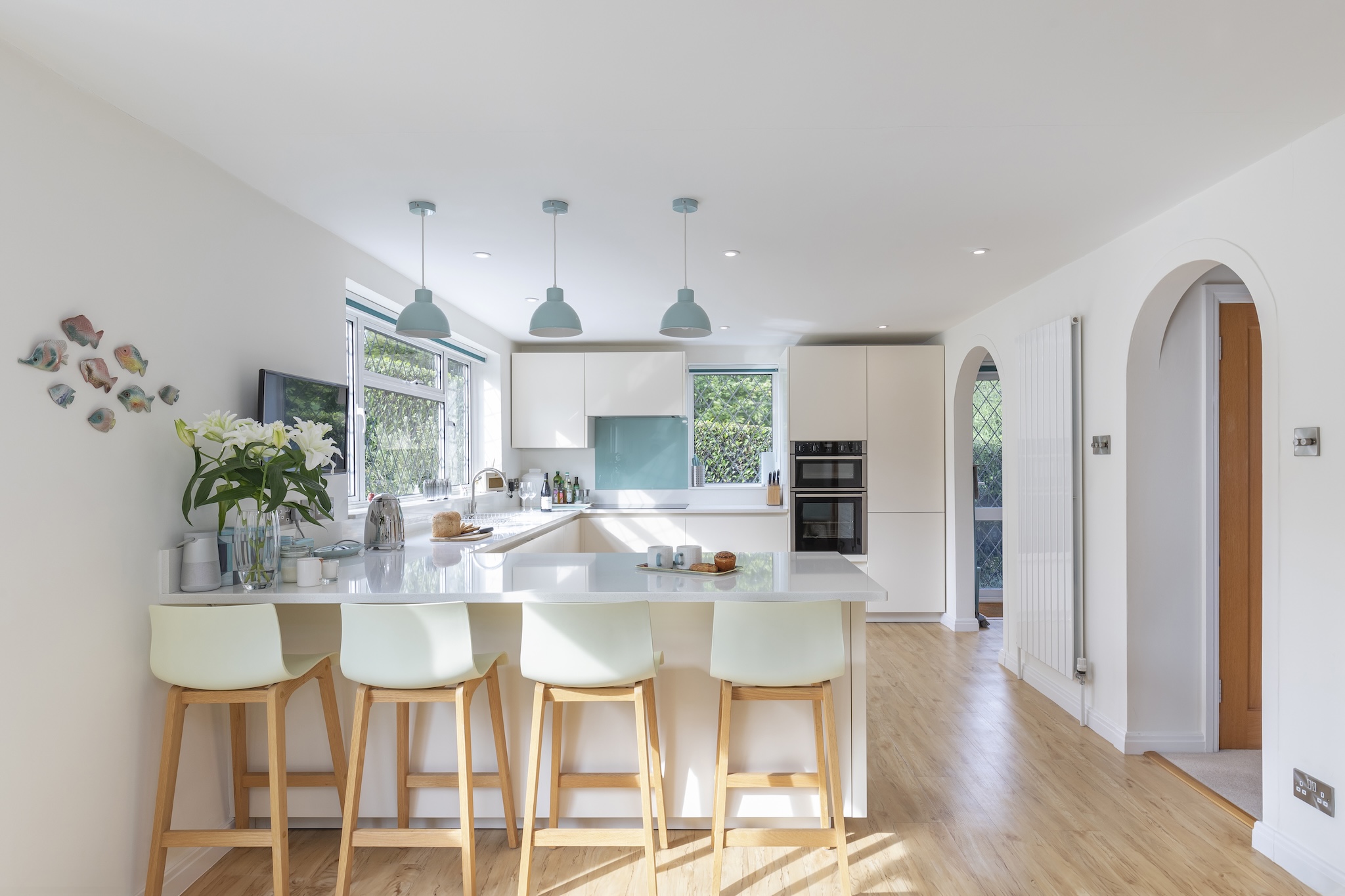 - Open-plan kitchen/dining/family space with central island and Karndean flooring