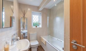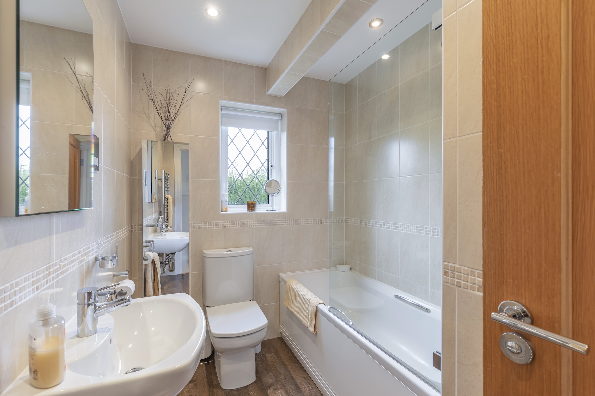 There are four further bedrooms, each bright and well-proportioned, offering flexibility for family, guests, or home working. A modern family bathroom serves these rooms, featuring a contemporary suite with bath and shower over, sleek tiling, and recessed lighting.