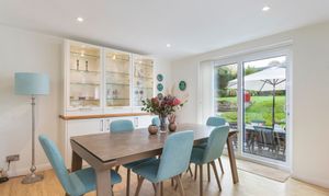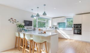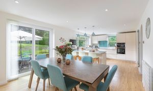 The heart of the home is the stunning open-plan kitchen and dining area, fitted in 2019 by Hamilton Stone. Thoughtfully designed and crafted to a high specification, it features bespoke cabinetry, Onyx worktops, and a range of Neff appliances, including an induction hob and soft-close cupboards. The Karndean flooring complements the sleek, contemporary design, while a central island with breakfast bar provides a sociable hub for everyday living. Pendant lighting and sliding doors create a bright, inviting atmosphere, with direct access to the garden for effortless indoor-outdoor entertaining.