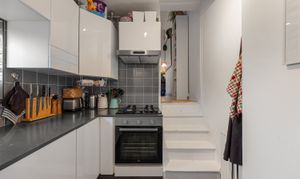 The kitchen sits just off the reception room and has been cleverly designed to make use of the space. The L-shape layout offers plenty of prep space, and the sleek white cabinetry contrasts beautifully against the dark worktops. There’s the all-important gas hob, and a window that brings in natural light and ventilation — always a welcome detail!