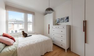 Both bedrooms are of reasonable size. The main bedroom comfortably accommodates a double bed and has integrated wardrobes on either side of the chimney breast. It feels calm and well-balanced, with good light and simple, neutral finishes. There’s engineered flooring again, making it easier to keep clean and allergen-free, especially if you want to keep a pet (note, cat not included!!)
