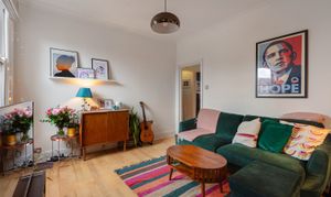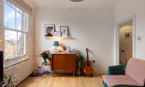 The reception room forms the heart of the flat and is a genuinely pleasant place to spend time. A large sash window draws in plenty of natural light, giving the room a bright, open feel while maintaining a sense of privacy as it isn’t overlooked. The room's proportions are good; there’s space for a proper seating area, with room left over for a dining table or desk, without the room feeling crowded. Built-in shelving allows for styling and offers practicality. It’s a versatile room that works equally well for relaxed evenings or informal entertaining, and with engineered flooring is easy to keep clean, whilst looking modern.