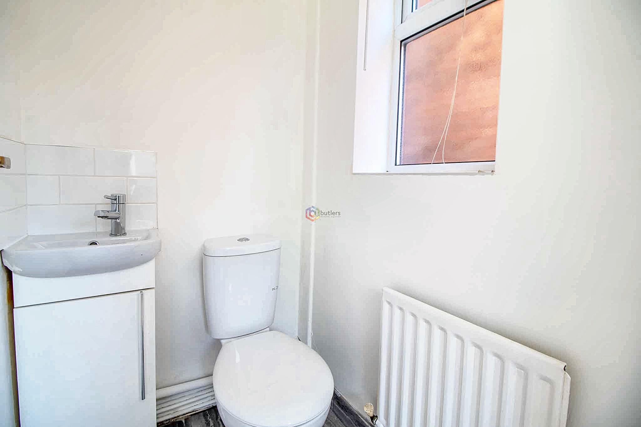A downstairs WC with a window to the side, a white WC and a white wash hand basin mounted on a vanity unit.
