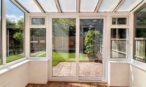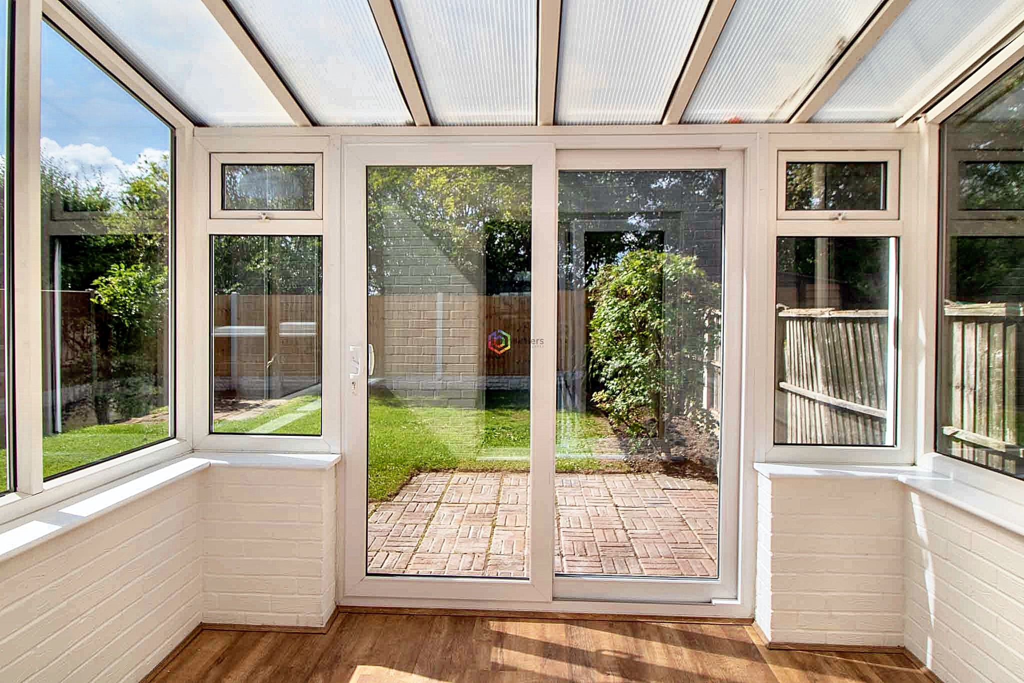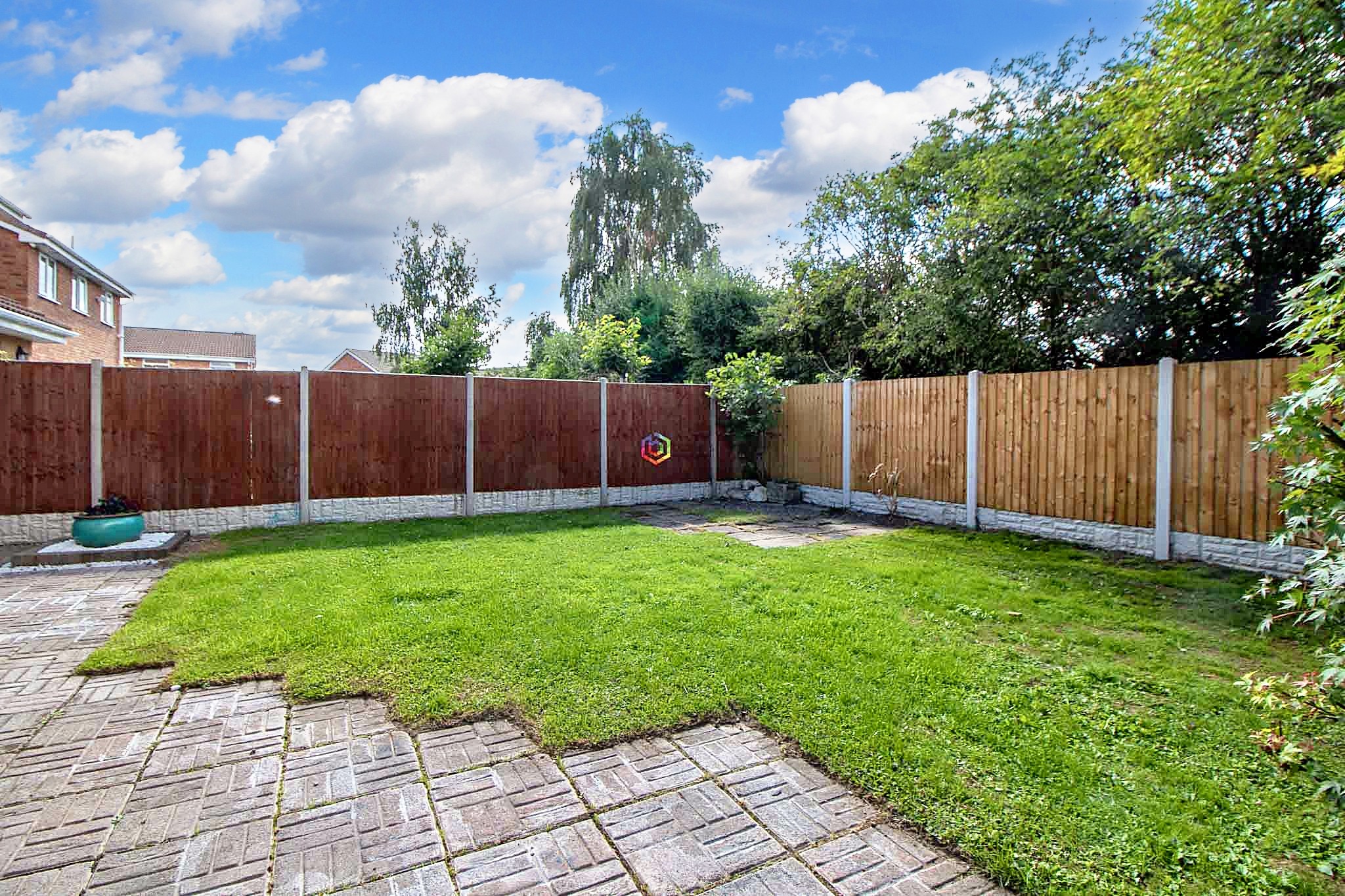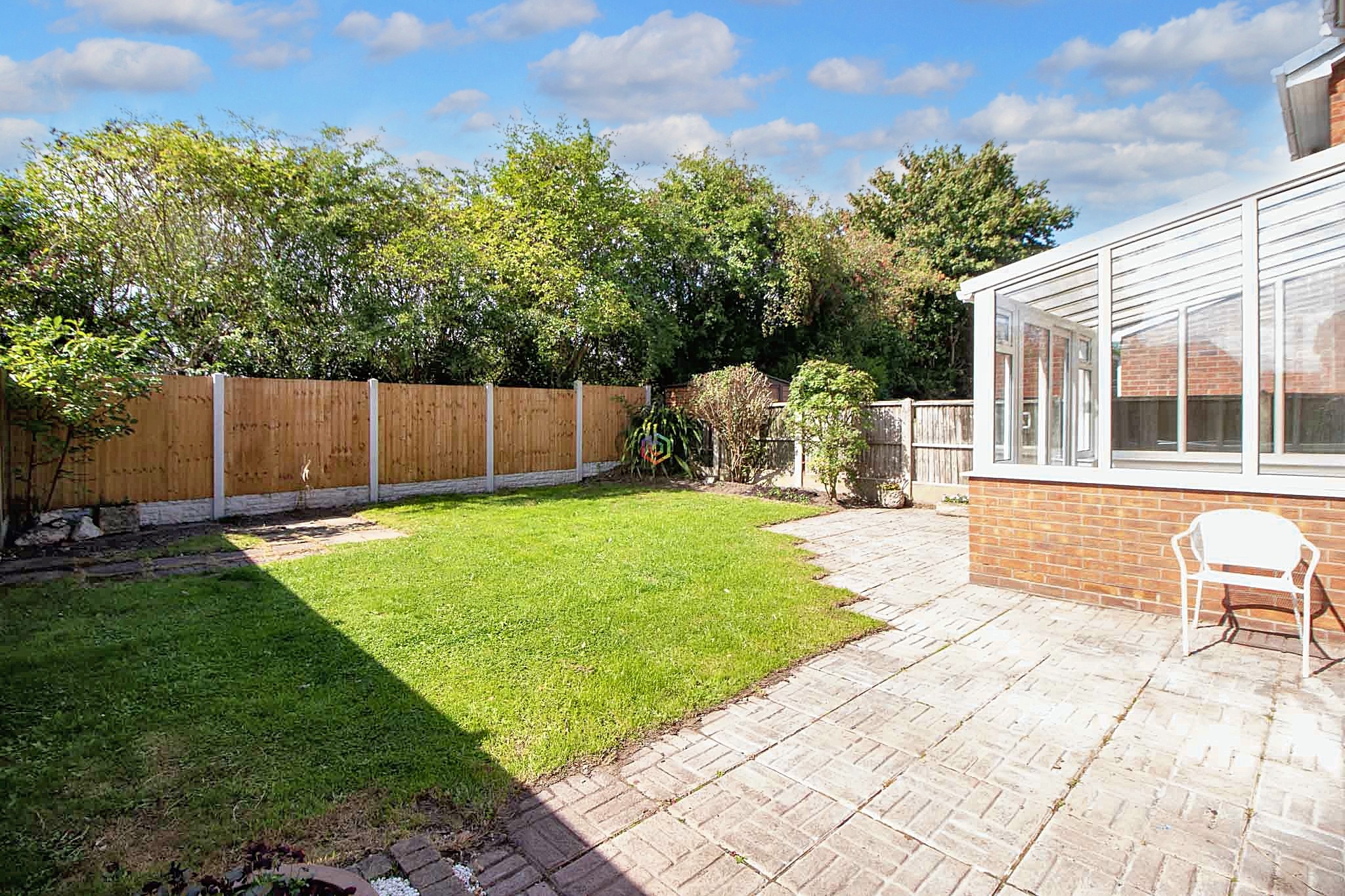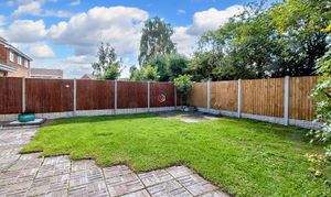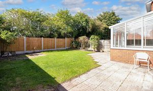 The rear garden is fully enclosed and has a patio seating area that surrounds the conservatory and the rear of the house. The lawn area has a border with shrubs and a further patio area to the corner of the garden.