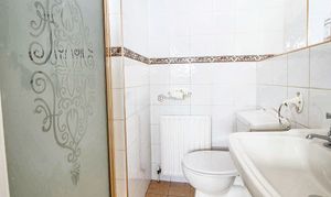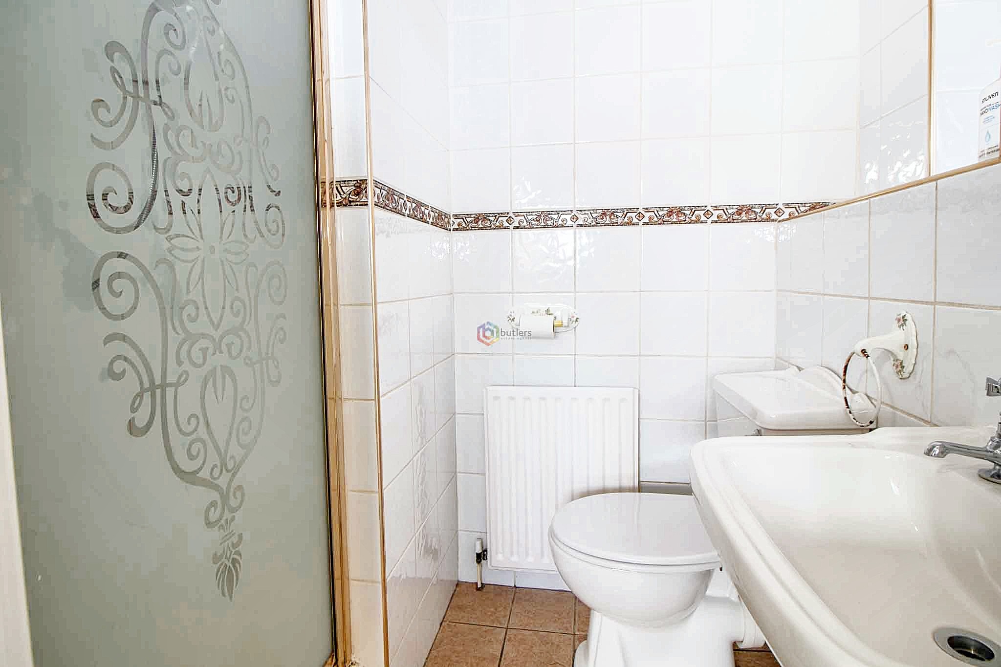 Fitted with a shower cubicle, white WC and white wash hand basin. There is a window to the side and the room is fully tiled.