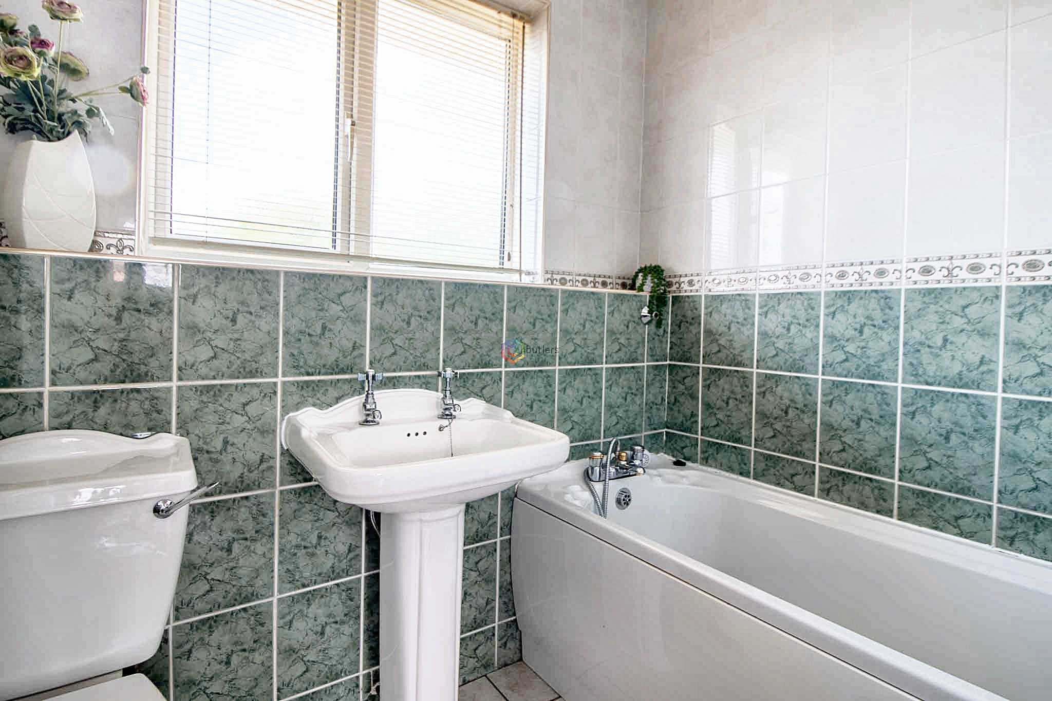 The bathroom is fitted with a white suite comprising, a white bath, a white WC and a white wash hand basin on a pedestal.