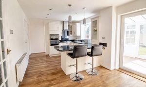 Desired by many is this kitchen/diner offering an area to cook and entertain. The kitchen is fitted with a range of wall and floor-mounted units in an ivory shaker style with contrasting black worksurfaces. There is an eye-level stainless steel double oven, a stainless steel four-burner gas hob and a glass and stainless steel extractor above. Fully integrated fridge and freezer and sink beneath the window overlooking the rear garden. A deep breakfast bar naturally divides the room which offers plenty of space for a dining set in front of the sliding patio door that leads into the conservatory. There is also a useful understairs store.