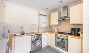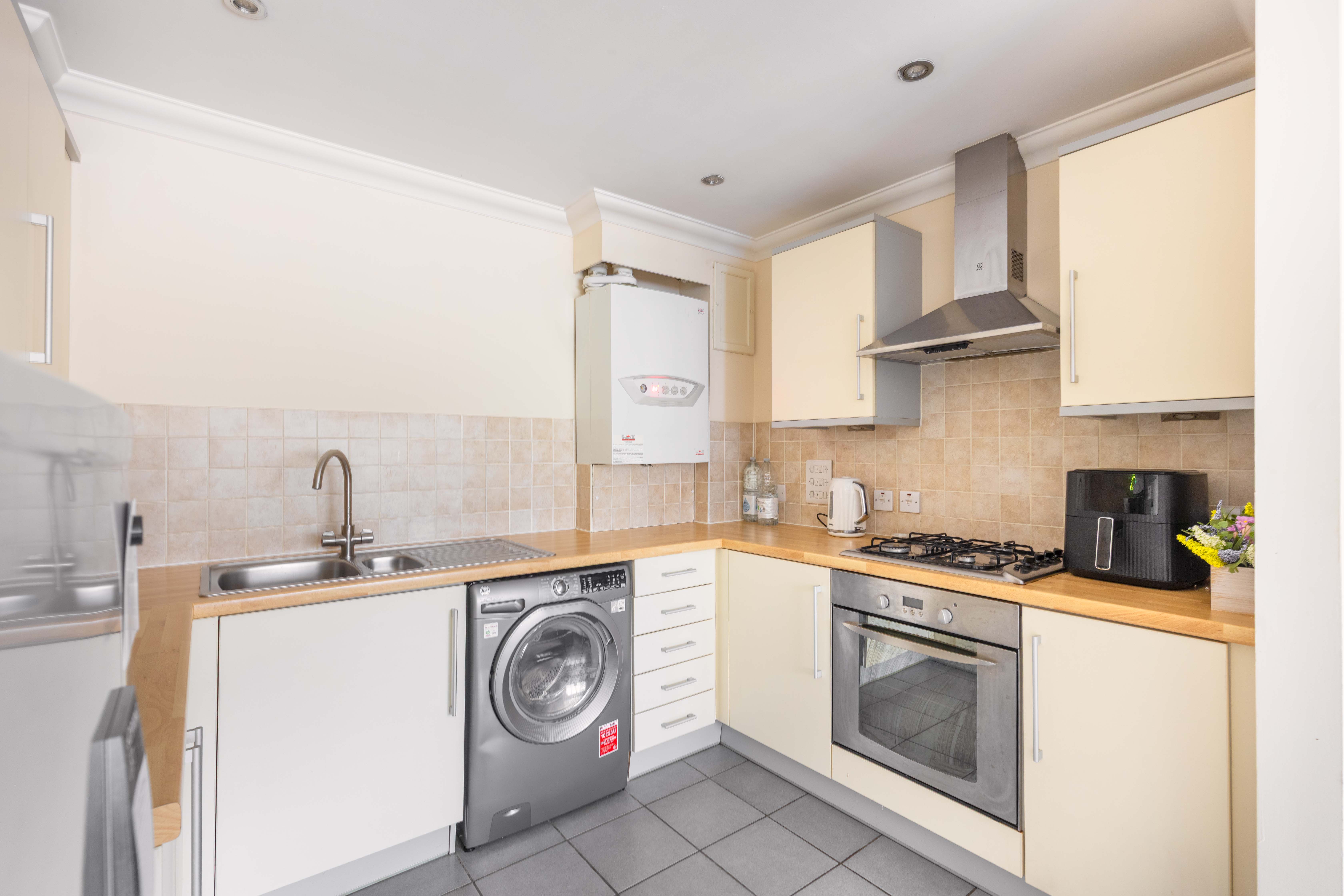 Thoughtfully designed, the property features a generous open plan kitchen, living and dining area, easily accommodating a well-proportioned seating area and a dining table and chairs, with a stylish kitchen positioned at the far end. The room is flooded with natural light from large windows fitted with plantation shutters. The kitchen is modern and well appointed, offering ample cabinetry, an integrated oven and hob, and space for both a washing machine and fridge freezer.