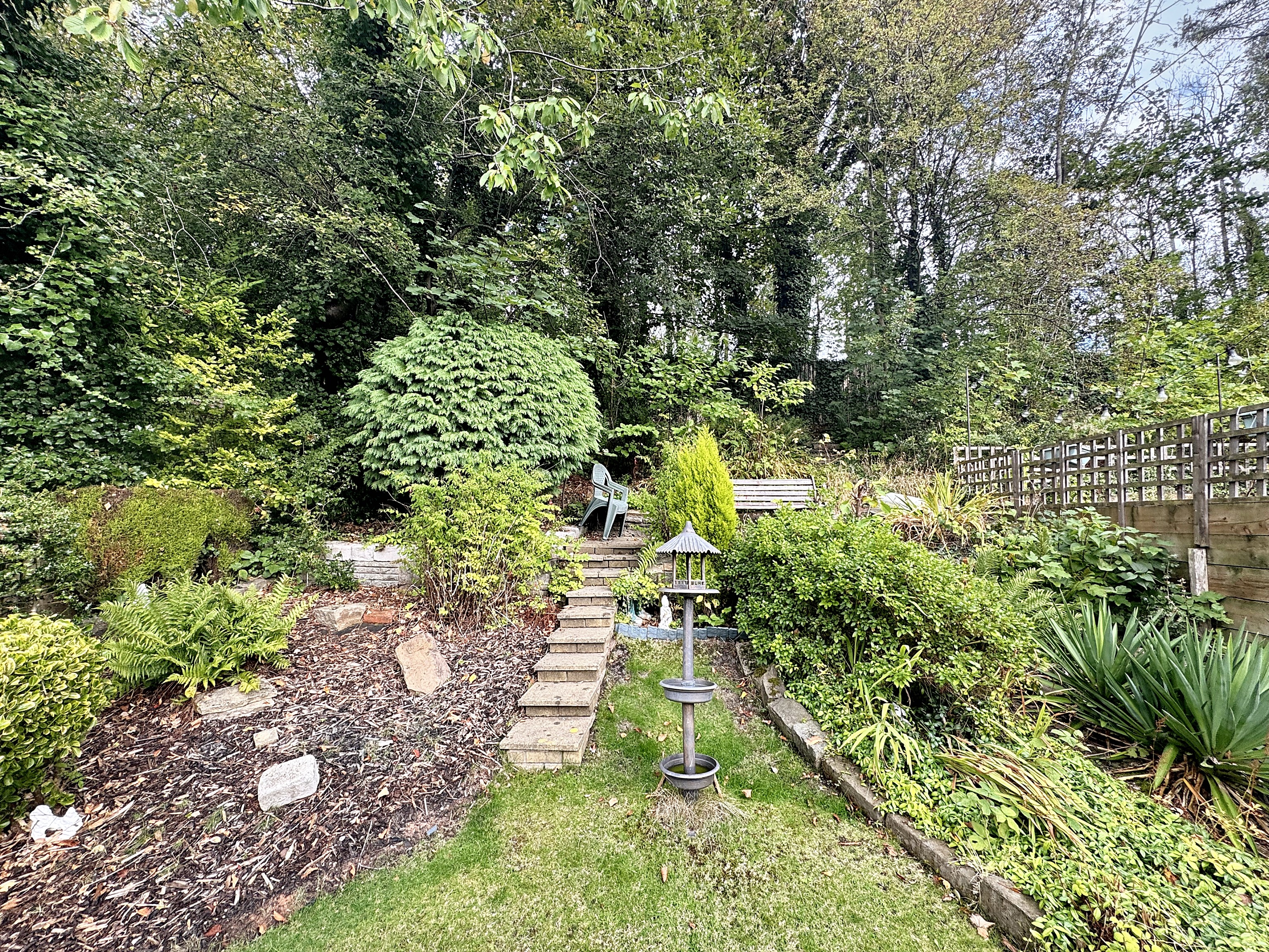 Externally, a private rear garden with neat lawn and patio area and driveway parking for multiple vehicles.