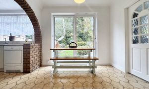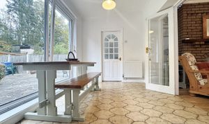 Open plan area from the kitchen with siding doors to the rear elevation. Double doors through to: