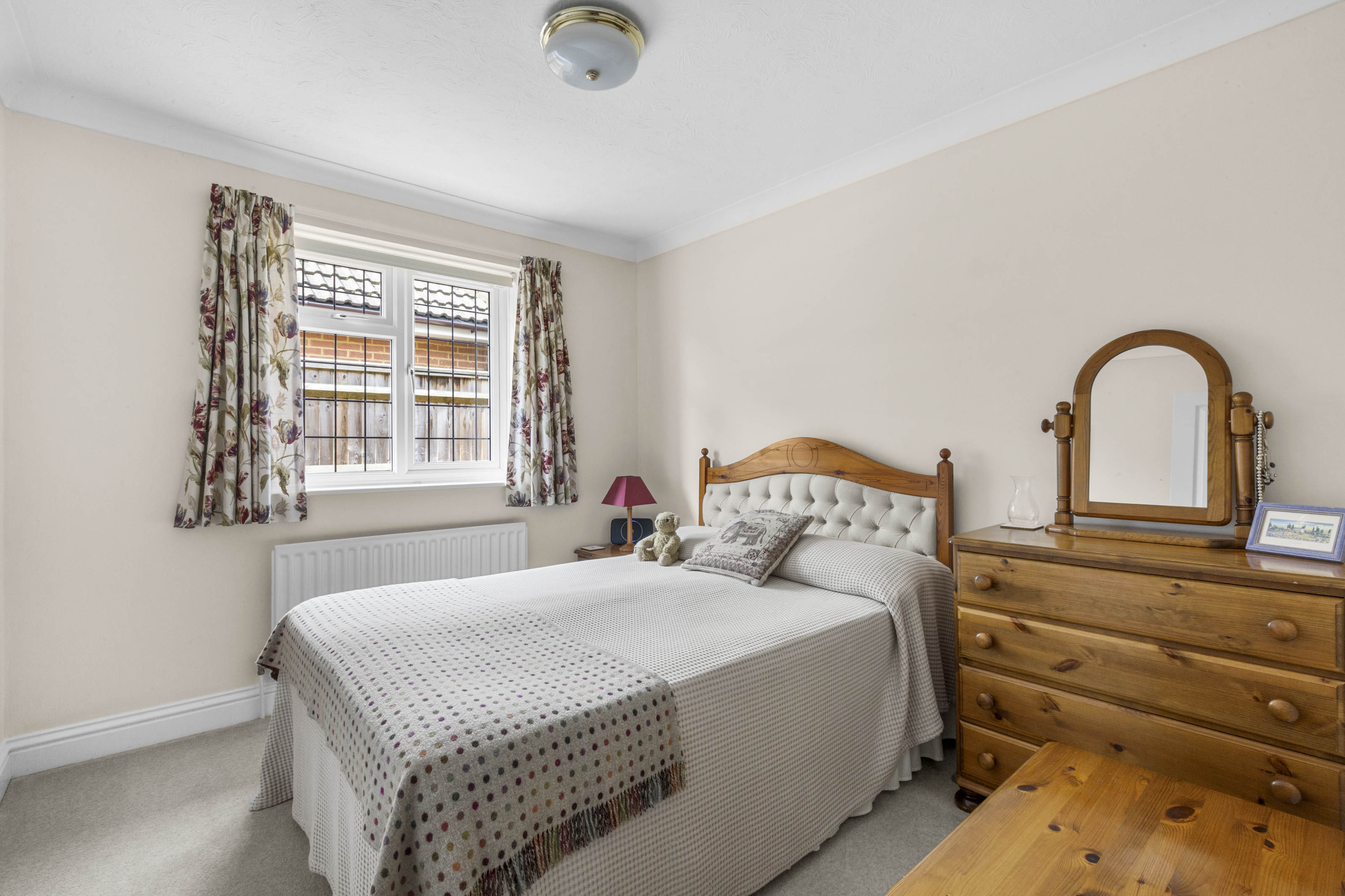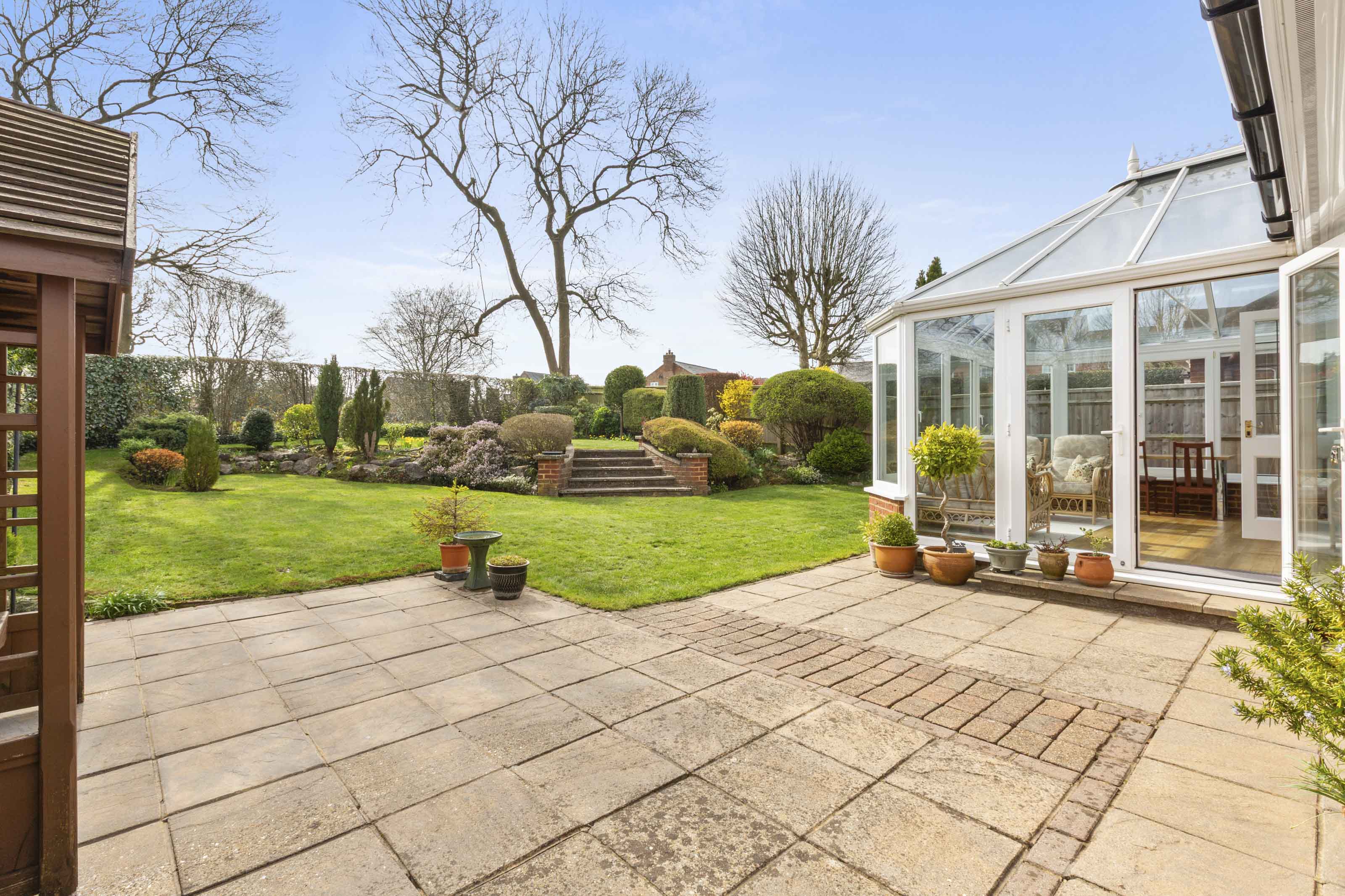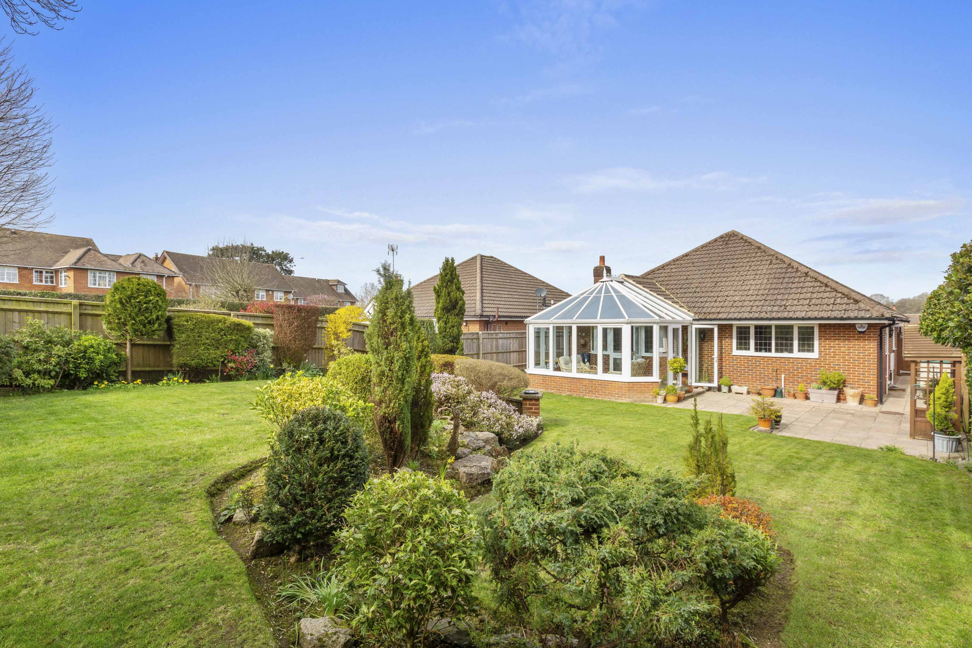 The approach to the property is enhanced by a well tended lawned front garden with driveway parking for two cars. The converted garage provides useful storage. Undoubtedly, one of the highlights of this bungalow is its beautifully landscaped southerly facing rear garden with a large patio area leading onto terraced lawns bordered by mature shrubs and trees and provides a pleasant and private outlook over ‘The Old Allotment’ field.