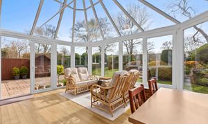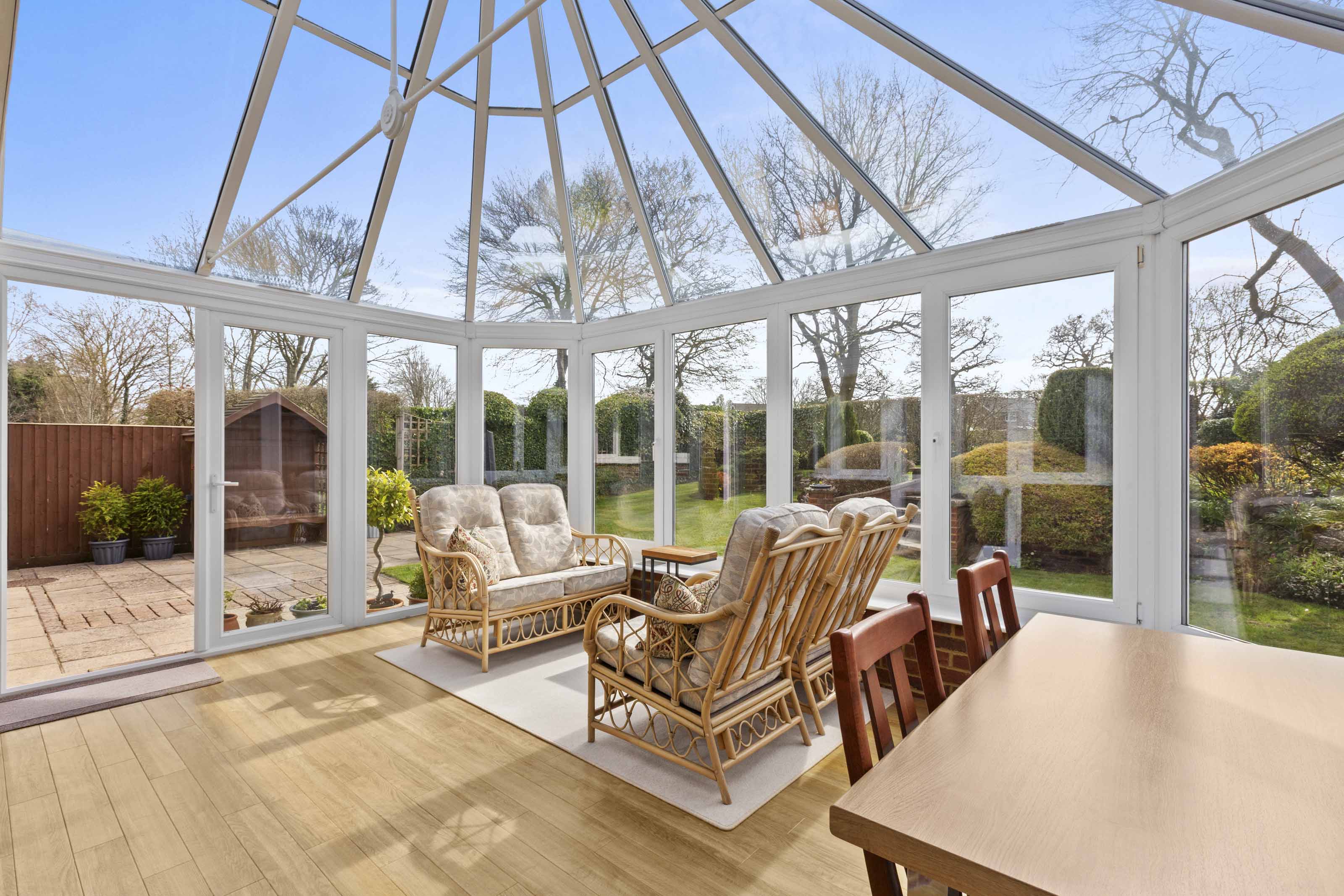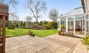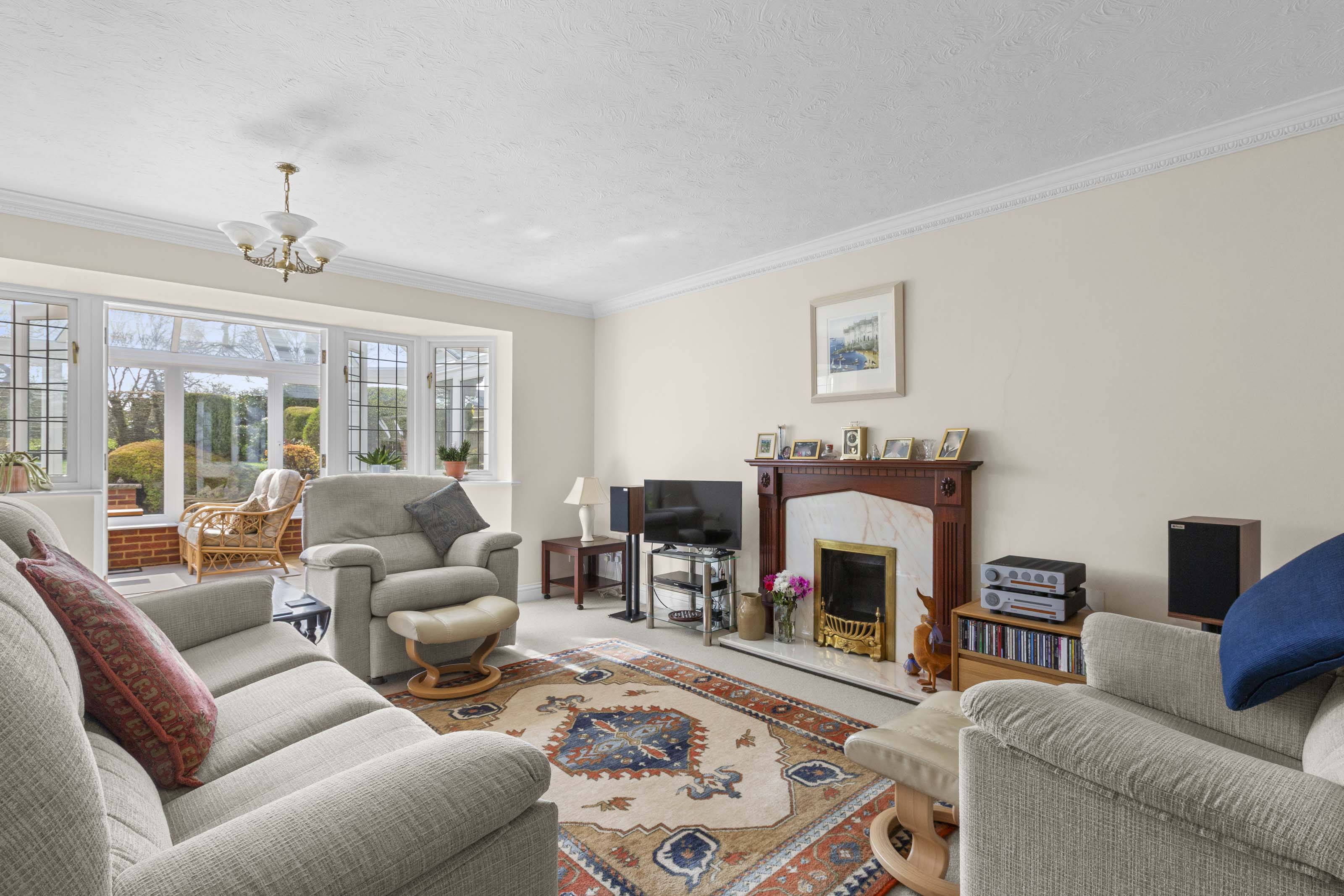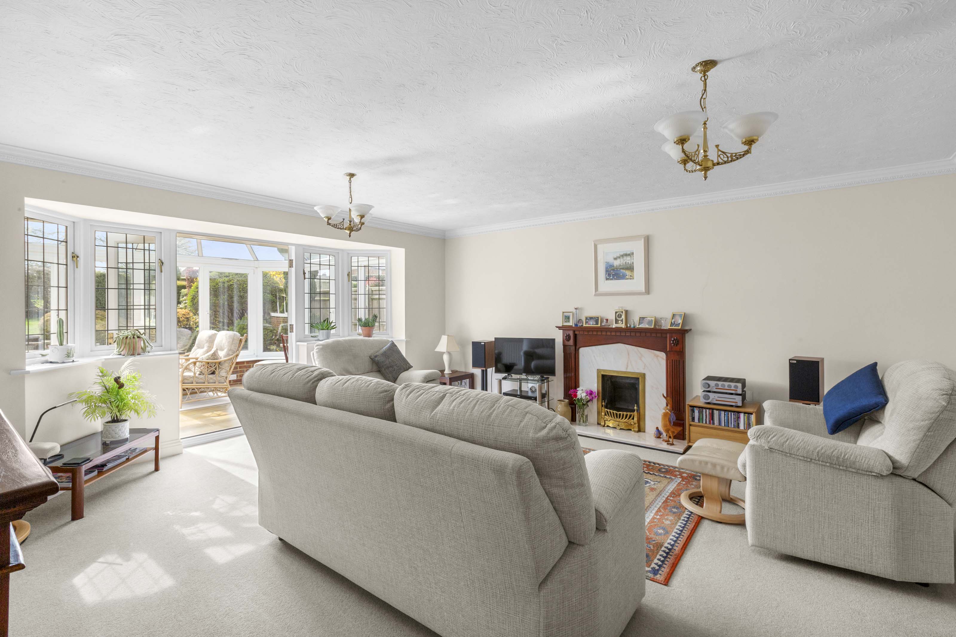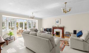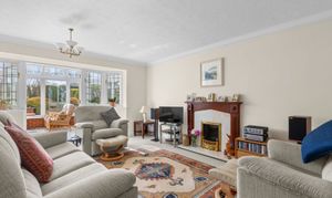 - Spacious sitting room with feature fireplace and French doors leading to a large conservatory