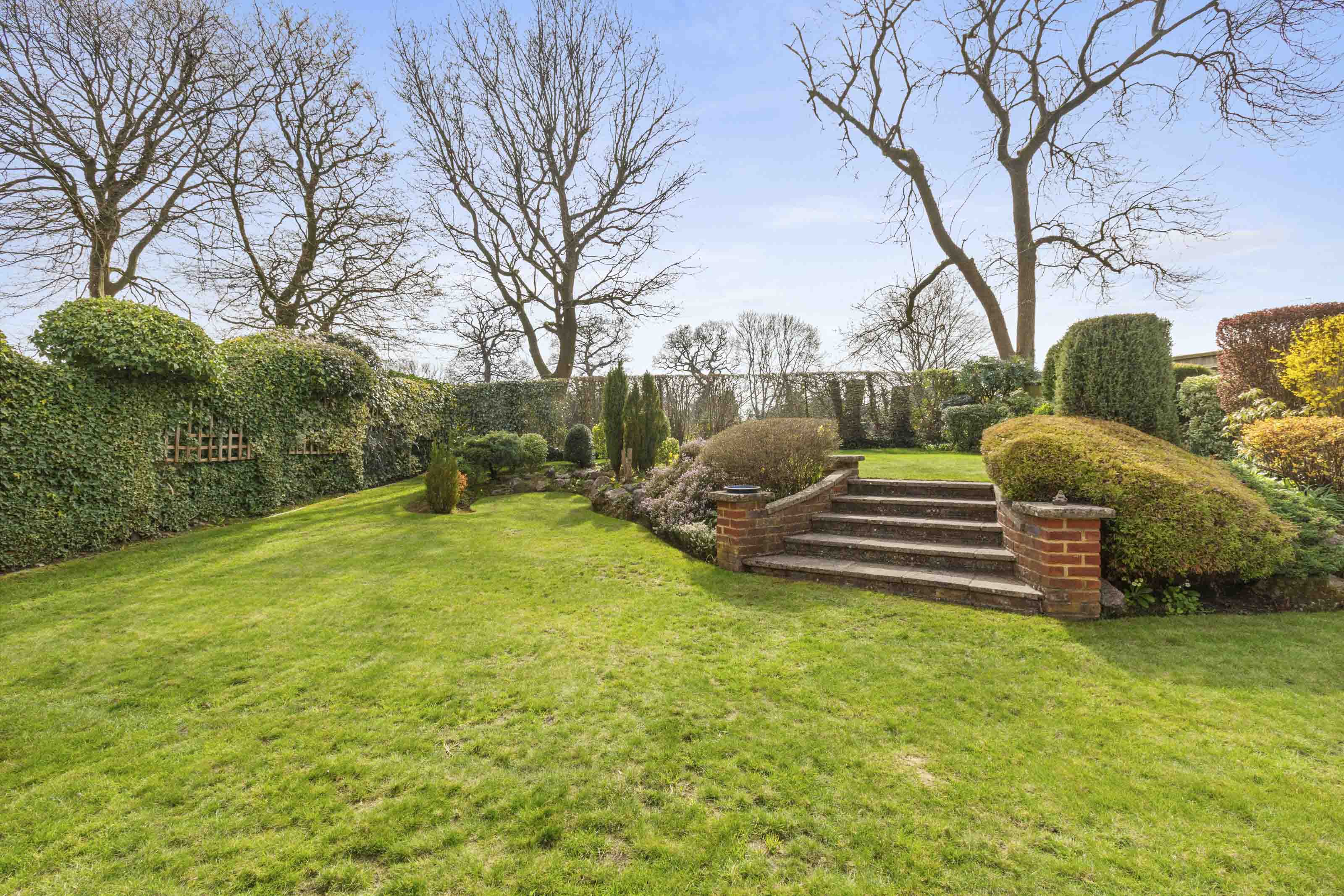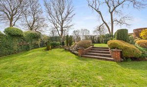- Undoubtedly a feature of this property is the attractive southerly facing rear garden with patio/seating area leading onto terraced lawns bordered with mature shrubs and trees