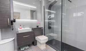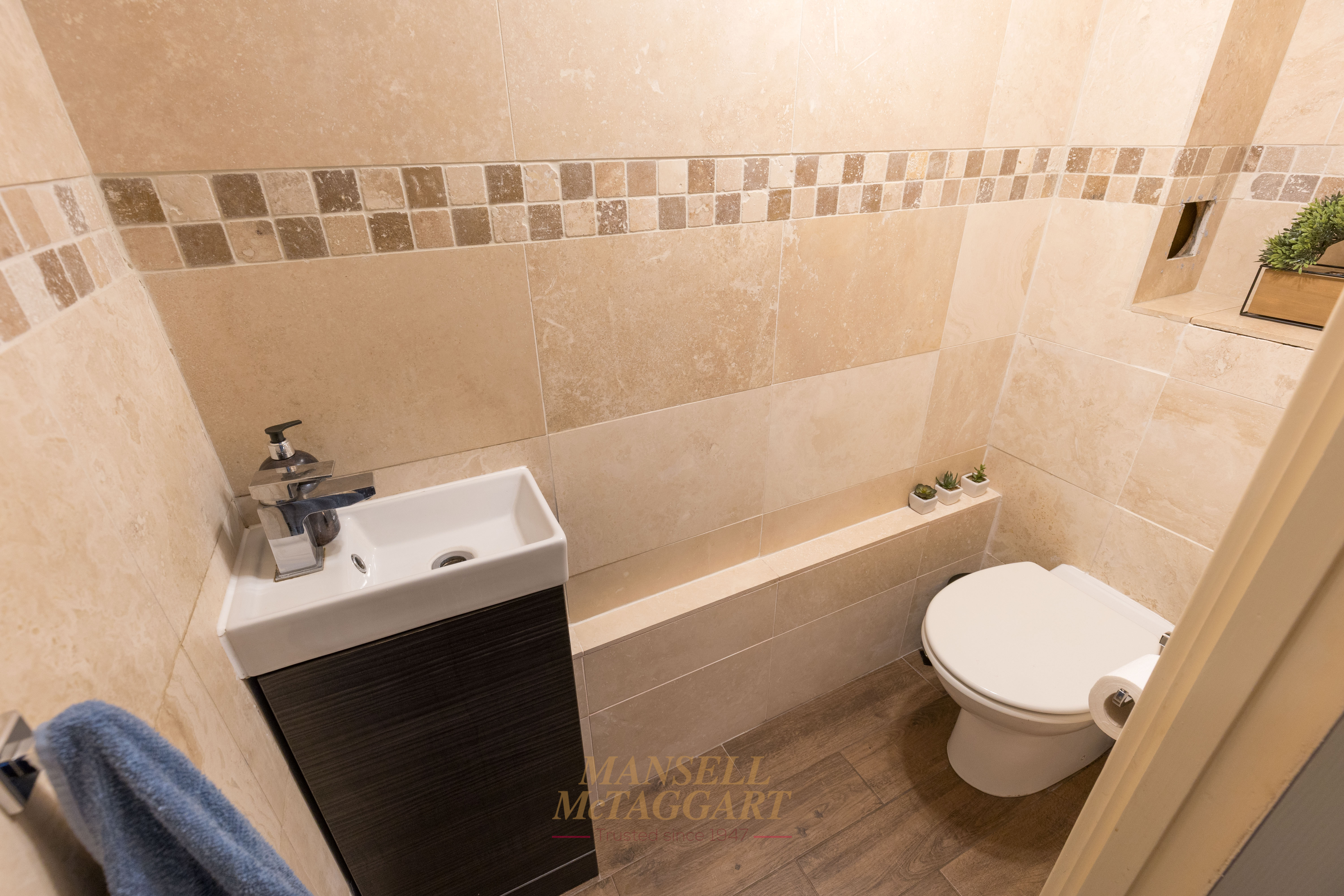 The well-proportioned cloakroom includes a modern WC and a wash-hand basin with practical storage beneath. Finished with recessed spotlights and contemporary tiling, it offers a stylish and functional convenience for both residents and guests.
