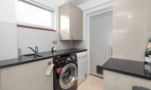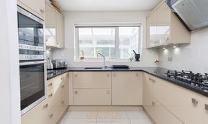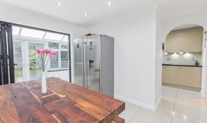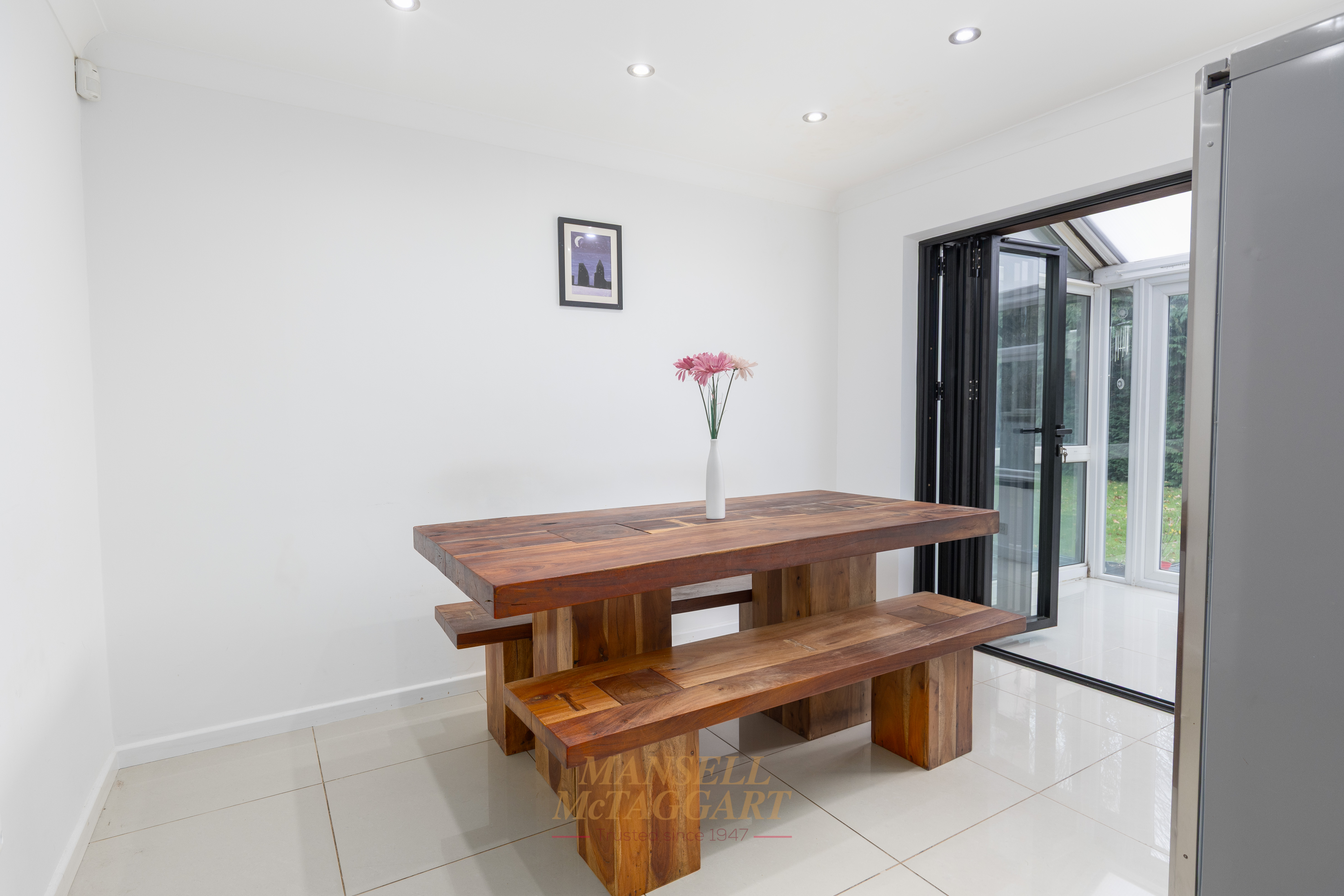 The double-aspect living room is one of the home's standout features. Generously sized and flooded with natural light, the room benefits from a striking pitched window that frames attractive views of the south-facing garden. The space easily accommodates multiple three-seater sofas, occasional chairs, and a full suite of freestanding furniture, making it ideal for both relaxed family time and more formal entertaining. Positioned at the rear of the home, the breakfast area features oversized floor tiles that enhance the sense of space and provide a cohesive flow into the adjoining kitchen. Bi-fold doors open directly into the conservatory—a part-brick, part-UPVC structure with panoramic garden views. This versatile room is perfect for dining, relaxation, or as an additional playroom, benefiting from excellent natural light throughout the day. The contemporary kitchen is fitted with sleek high-gloss wall and base units offering generous storage and easy maintenance. Integrated appliances include an electric oven, microwave, and dishwasher. The countertops provide ample workspace, and a window overlooking the garden ensures a pleasant backdrop while preparing meals. Oversized floor tiling, recessed spotlights, and clean modern lines contribute to a fresh, polished look. Adjacent to the kitchen is a practical utility room fitted with additional wall and base units, a sink unit, and plumbing/space for both a washing machine and tumble dryer. Durable oversized tiling continues here, and a door provides direct access into the double garage—ideal for unloading shopping or entering the home during inclement weather. There is underfloor heating throughout the downstairs.