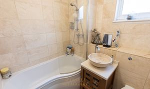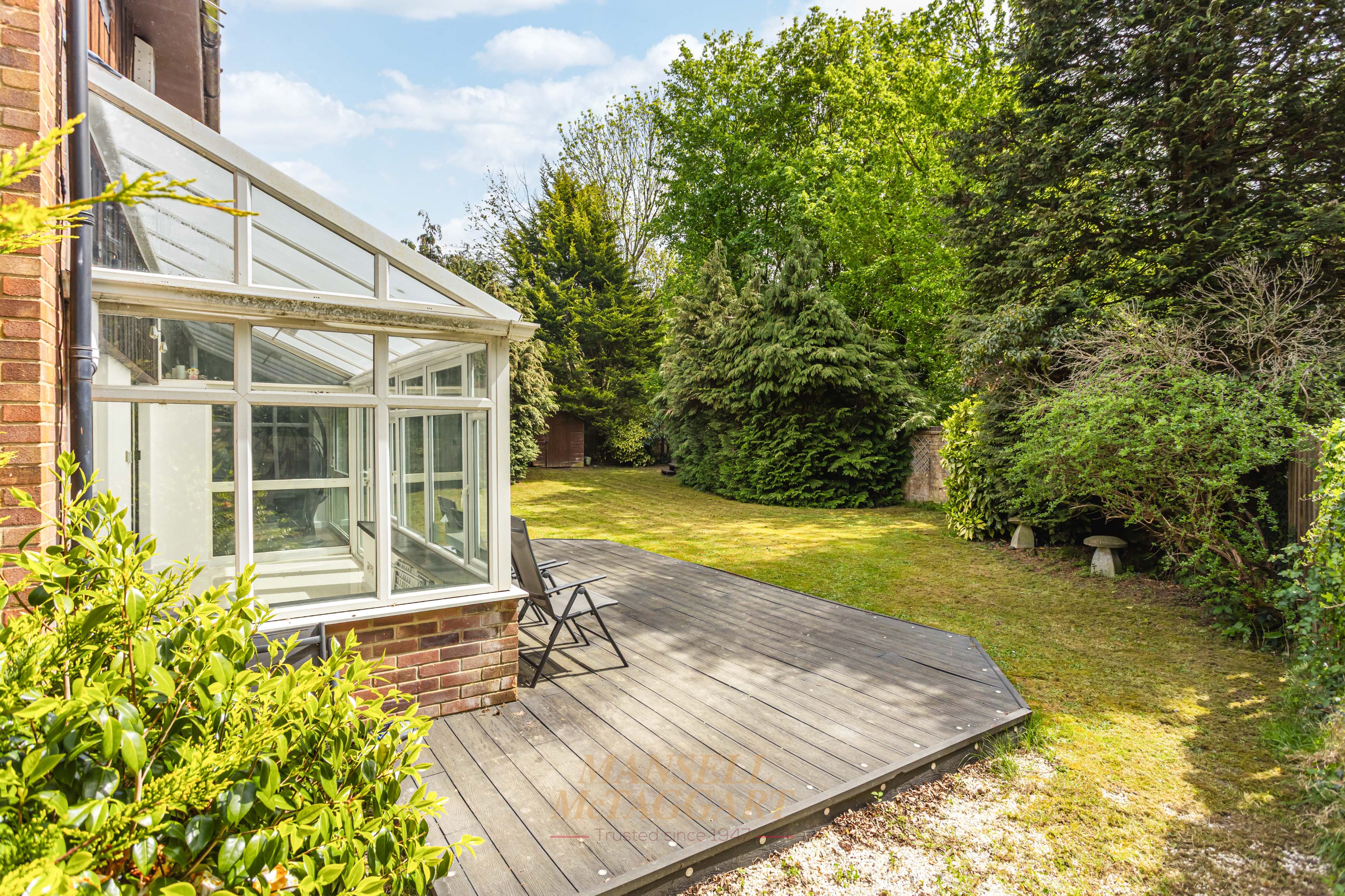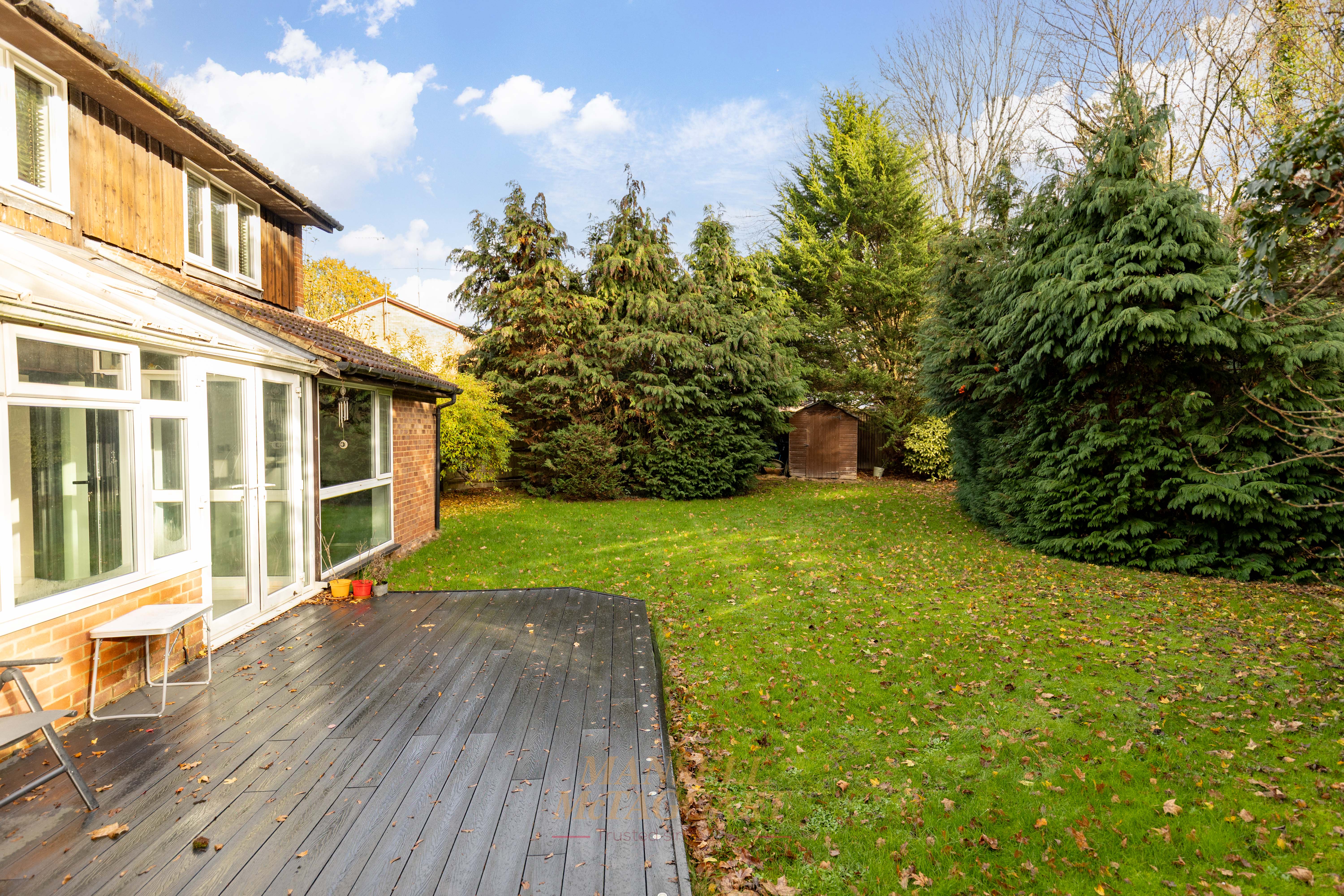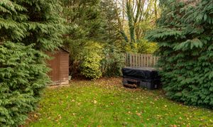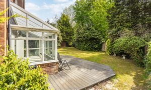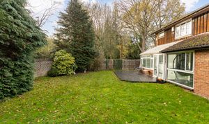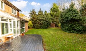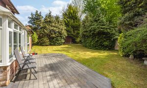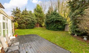 The modern family bathroom is beautifully appointed with a panelled bath fitted with a power shower, a sleek stone-effect basin with storage, WC recess, ceramic stone-effect tiling, recessed lighting, and an extractor fan. It offers a clean, contemporary feel with a practical, family-friendly design. One of the property's most impressive assets is the large south-facing rear garden. Accessed via side gates or through the conservatory, the garden is predominantly laid out as a well-maintained lawn, offering abundant space for children to play or for large outdoor gatherings. A raised decking area adjacent to the conservatory creates an ideal spot for al fresco dining or relaxing in the sun. The borders are generously planted with a wide selection of mature trees, shrubs, and perennials, providing colour, privacy, and structure. The fully enclosed garden offers both seclusion and the opportunity to further landscape or extend if desired.