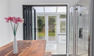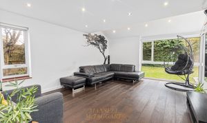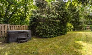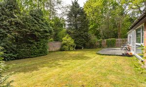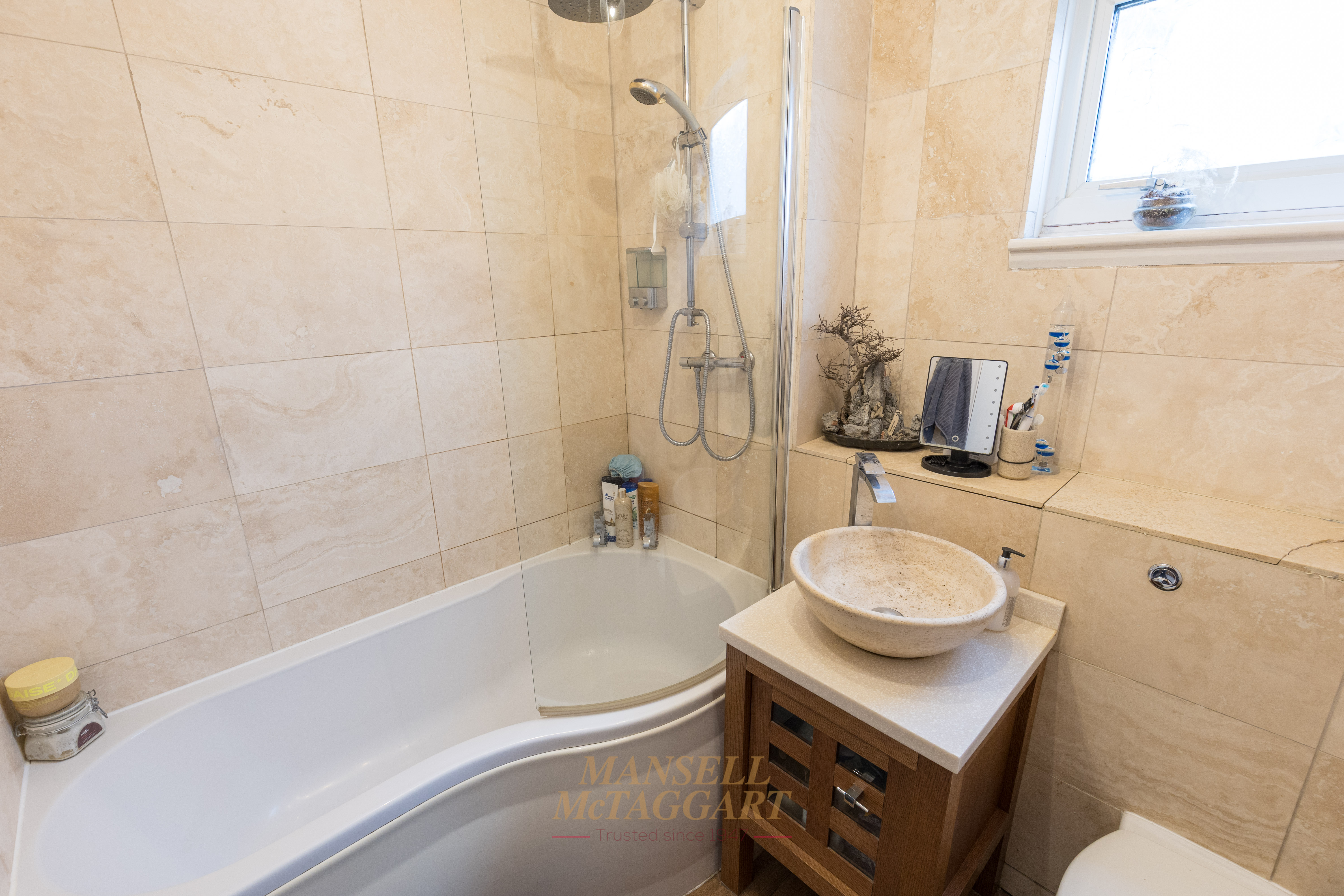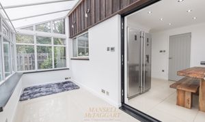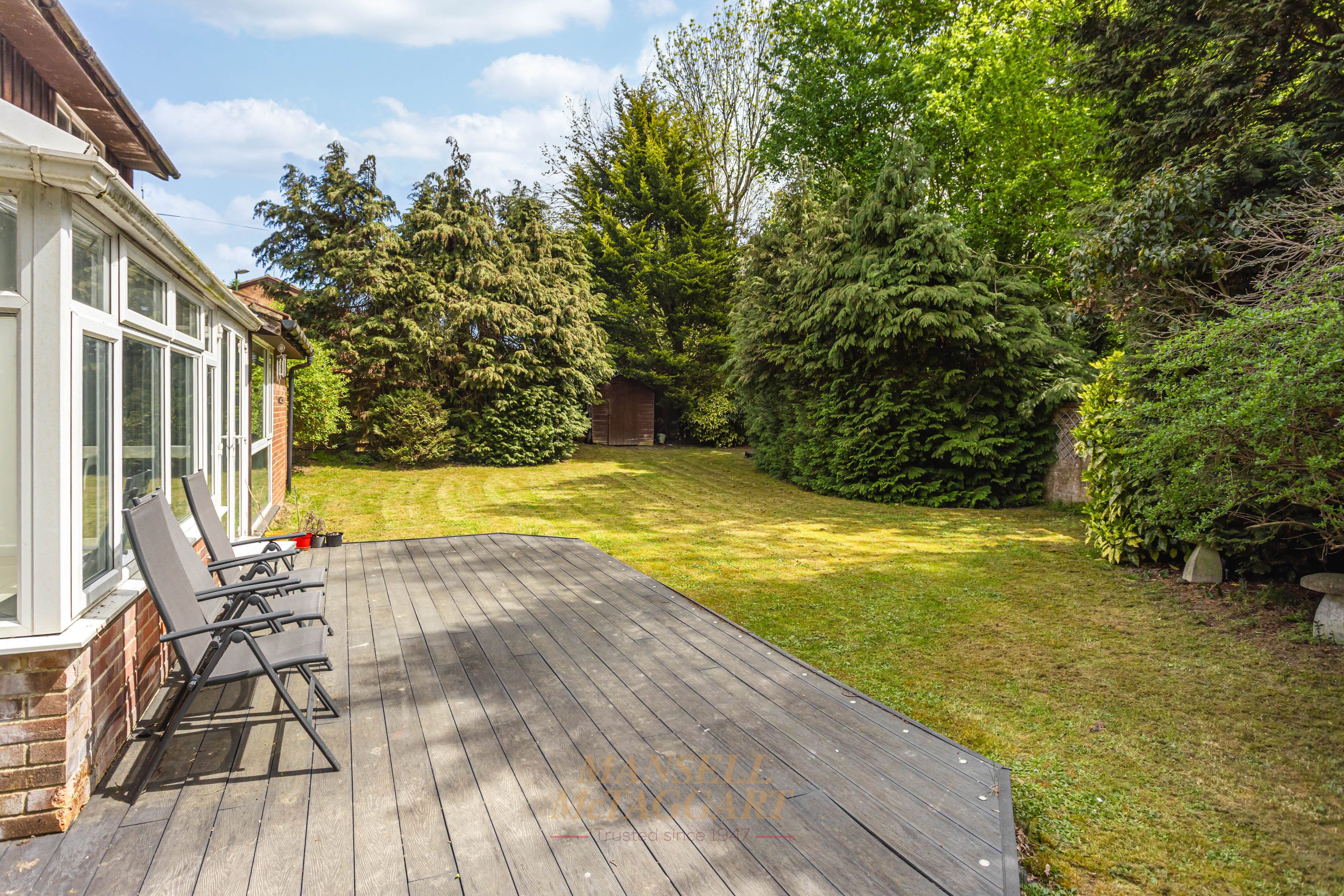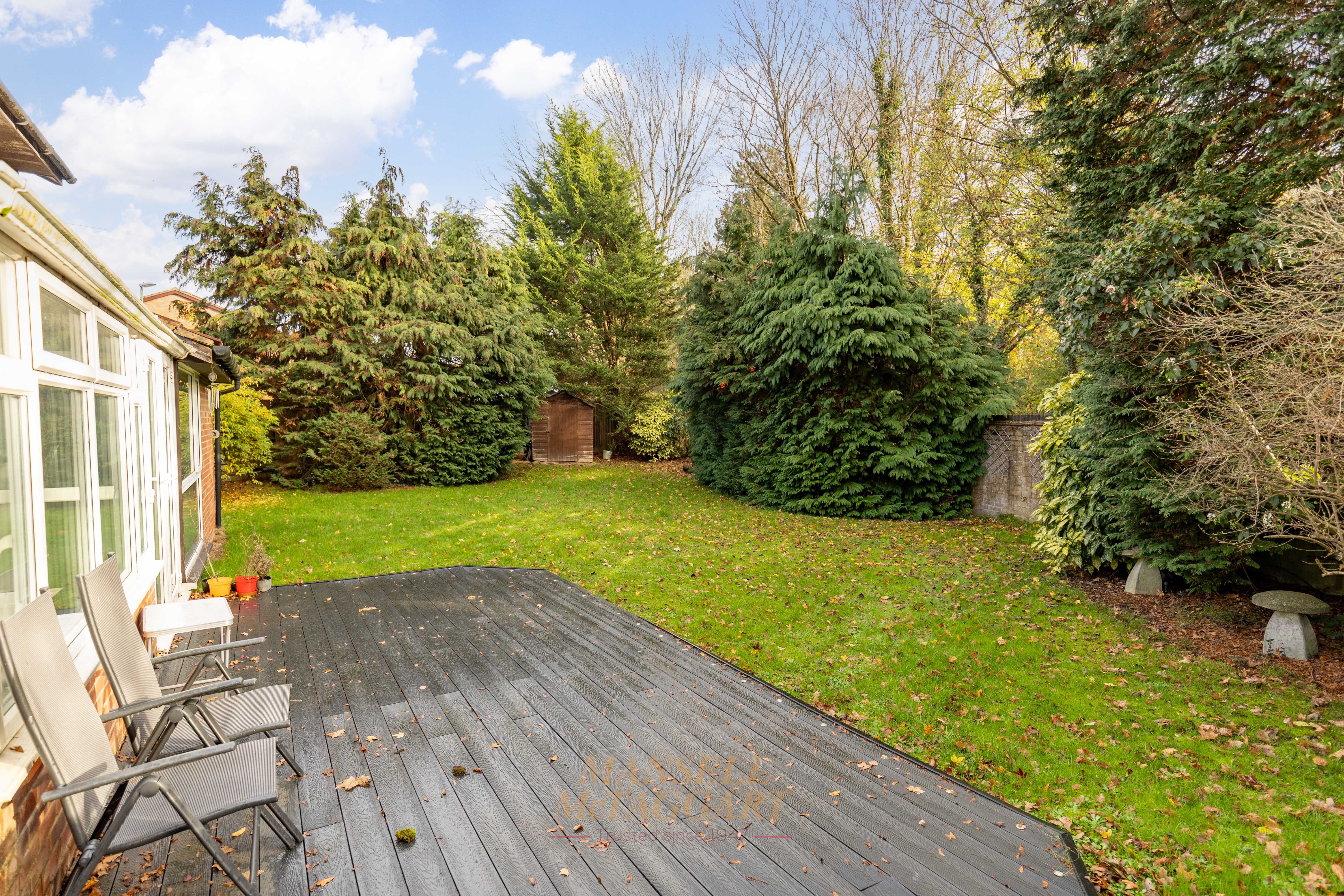 The modern family bathroom is beautifully appointed with a panelled bath fitted with a power shower, a sleek stone-effect basin with storage, WC recess, ceramic stone-effect tiling, recessed lighting, and an extractor fan. It offers a clean, contemporary feel with a practical, family-friendly design. One of the property's most impressive assets is the large south-facing rear garden. Accessed via side gates or through the conservatory, the garden is predominantly laid out as a well-maintained lawn, offering abundant space for children to play or for large outdoor gatherings. A raised decking area adjacent to the conservatory creates an ideal spot for al fresco dining or relaxing in the sun. The borders are generously planted with a wide selection of mature trees, shrubs, and perennials, providing colour, privacy, and structure. The fully enclosed garden offers both seclusion and the opportunity to further landscape or extend if desired.