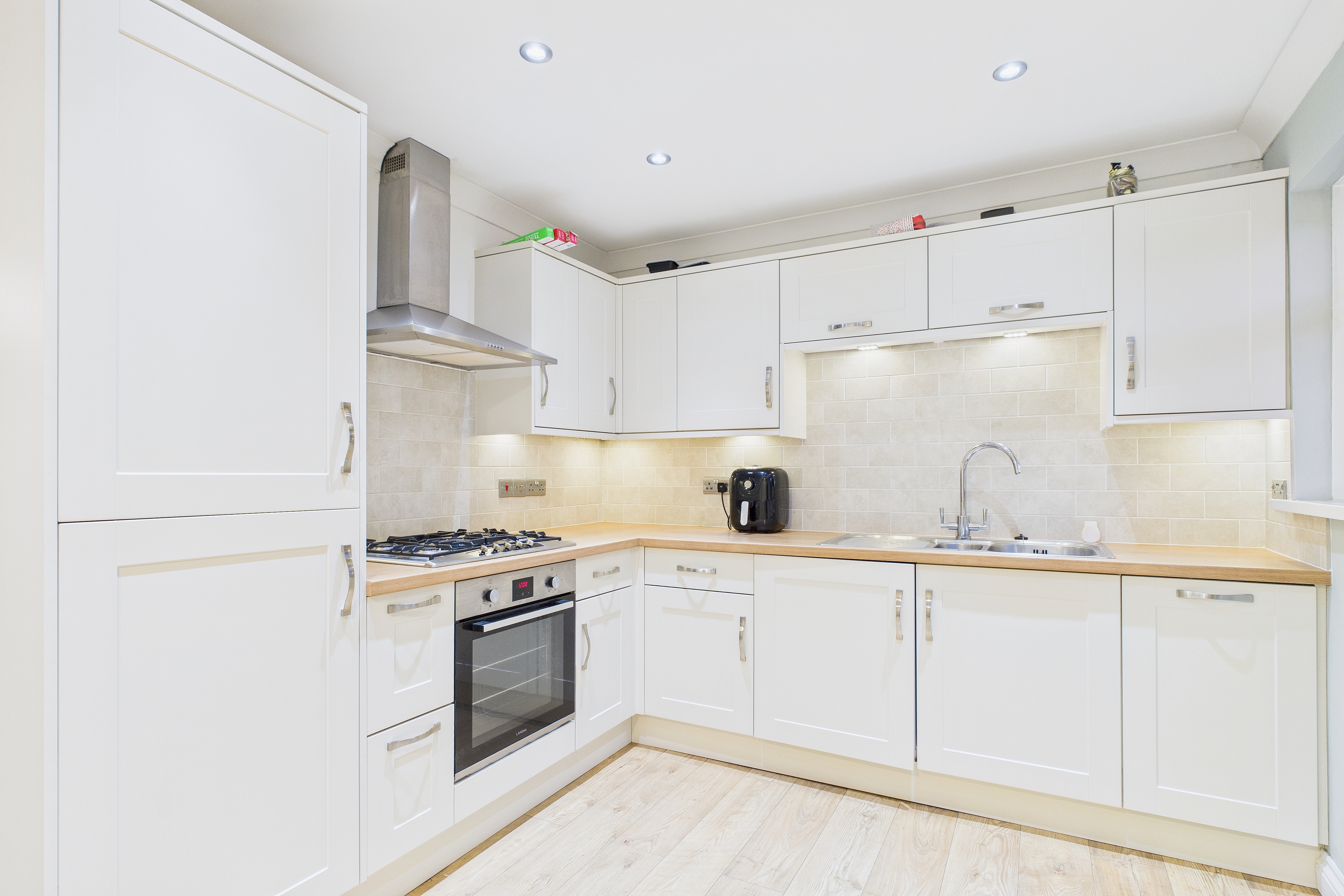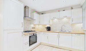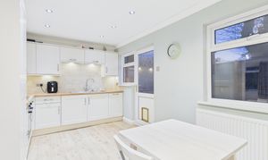 The dining kitchen is fitted with a tasteful range of cream-fronted wall, base and drawer units, complemented by wood-effect laminate work surfaces and brushed metal fittings. Integrated appliances include a Neff gas hob, built-under Lamona electric oven and grill, fridge freezer, washing machine and slimline dishwasher. An external door provides direct access to the rear garden, and there is a useful understairs storage cupboard.