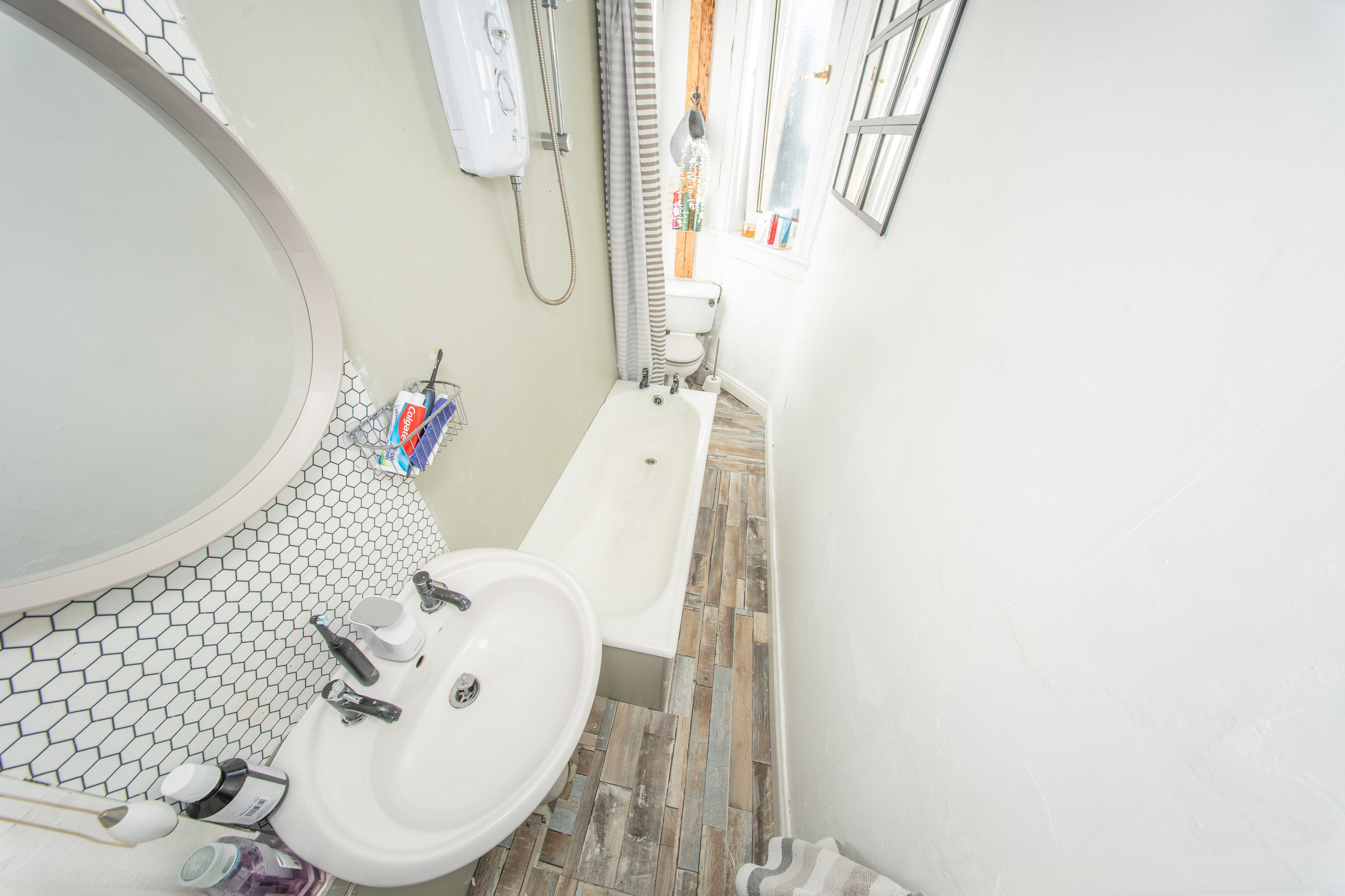 A stylish bathroom featuring wooden flooring and crisp white painted walls. The suite comprises a WC, white wash basin, and a bath with overhead shower, creating a clean and modern space.