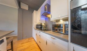 A sleek and stylish kitchen fitted with a range of ample base and wall units, complemented by an electric hob with curved glass chimney hood and integrated oven. The space also features a stainless steel sink with drainer and a comfortable seating area for two.
