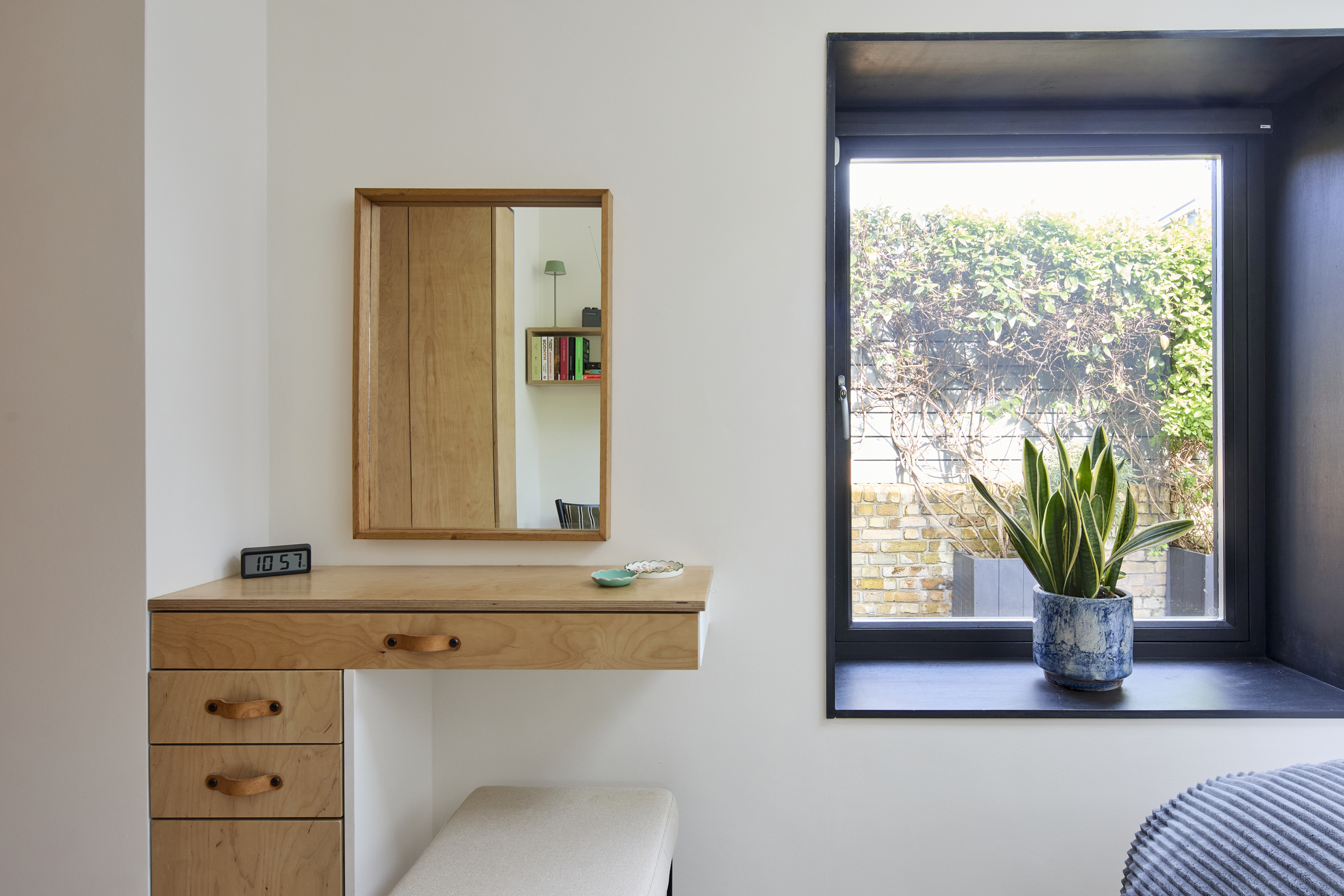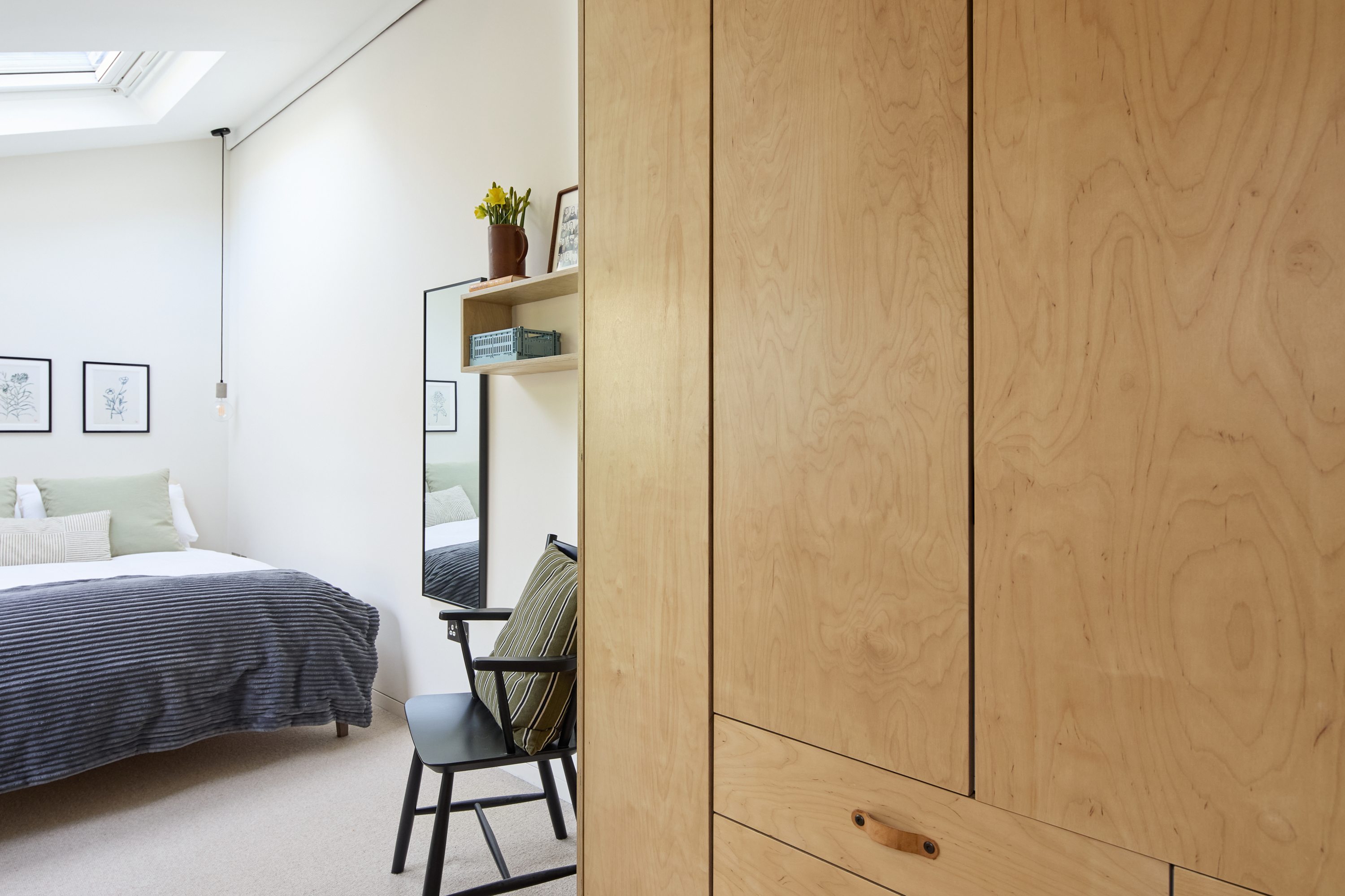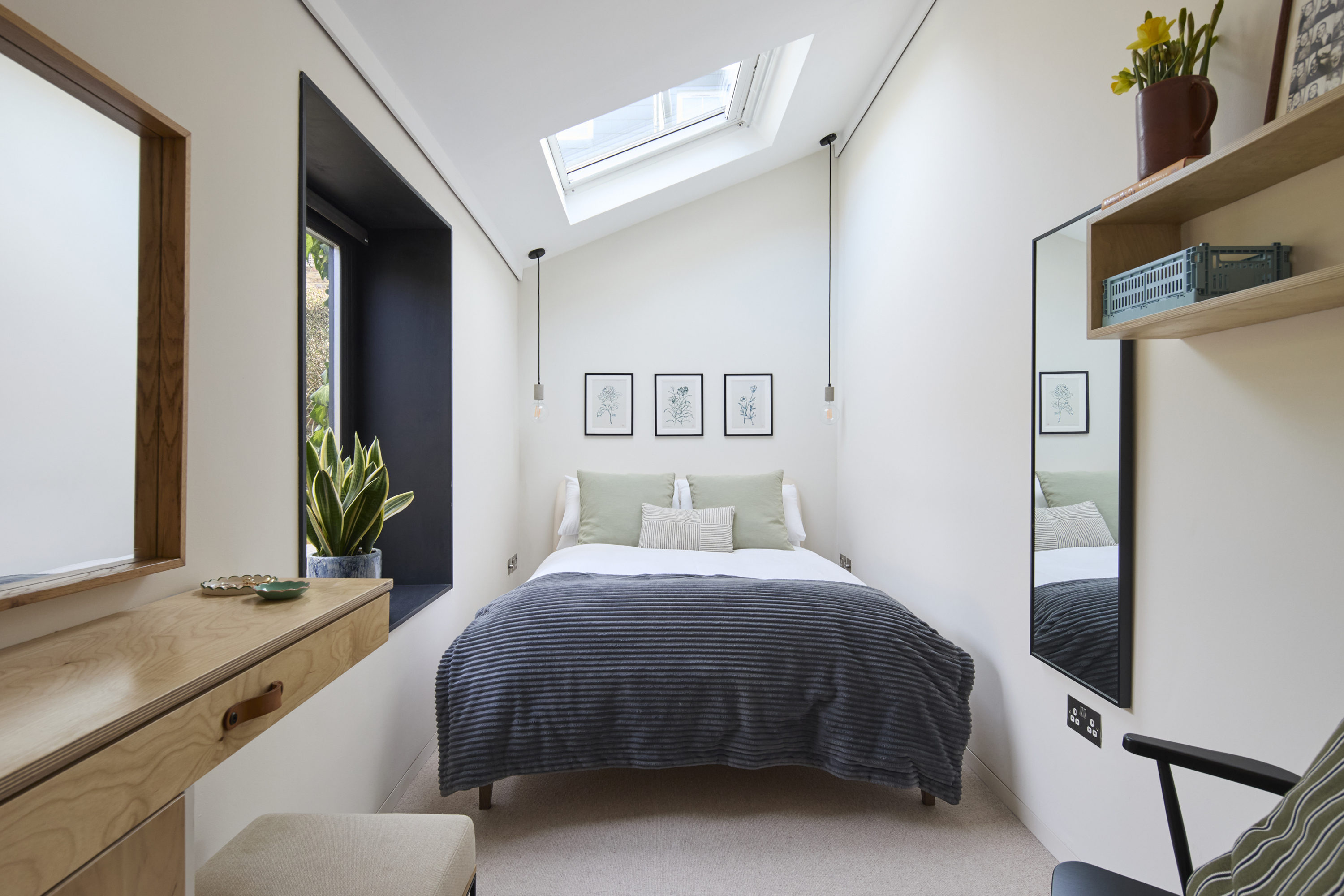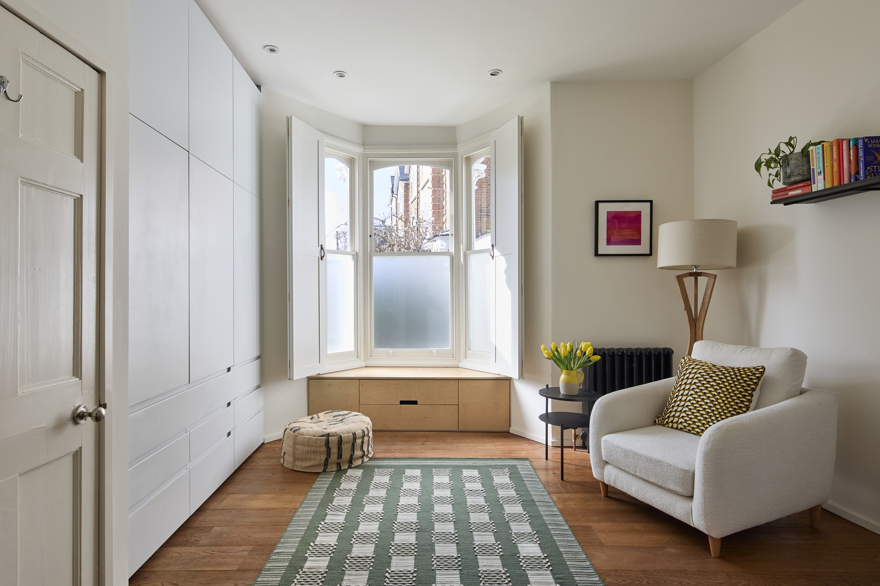 At the back, the kitchen opens onto the garden, creating a sense of flow between inside and out. Just beyond, the principal bedroom sits within a garden extension — providing a rare pocket of peace for London. Here, a picture window overlooks the greenery, bespoke joinery keeps everything streamlined, and a nearby bathroom completes the retreat-like feel. The garden itself is fully decked with thoughtful edge planting and, at the far end, there is a pint-sized studio — ideal for creative pursuits.
