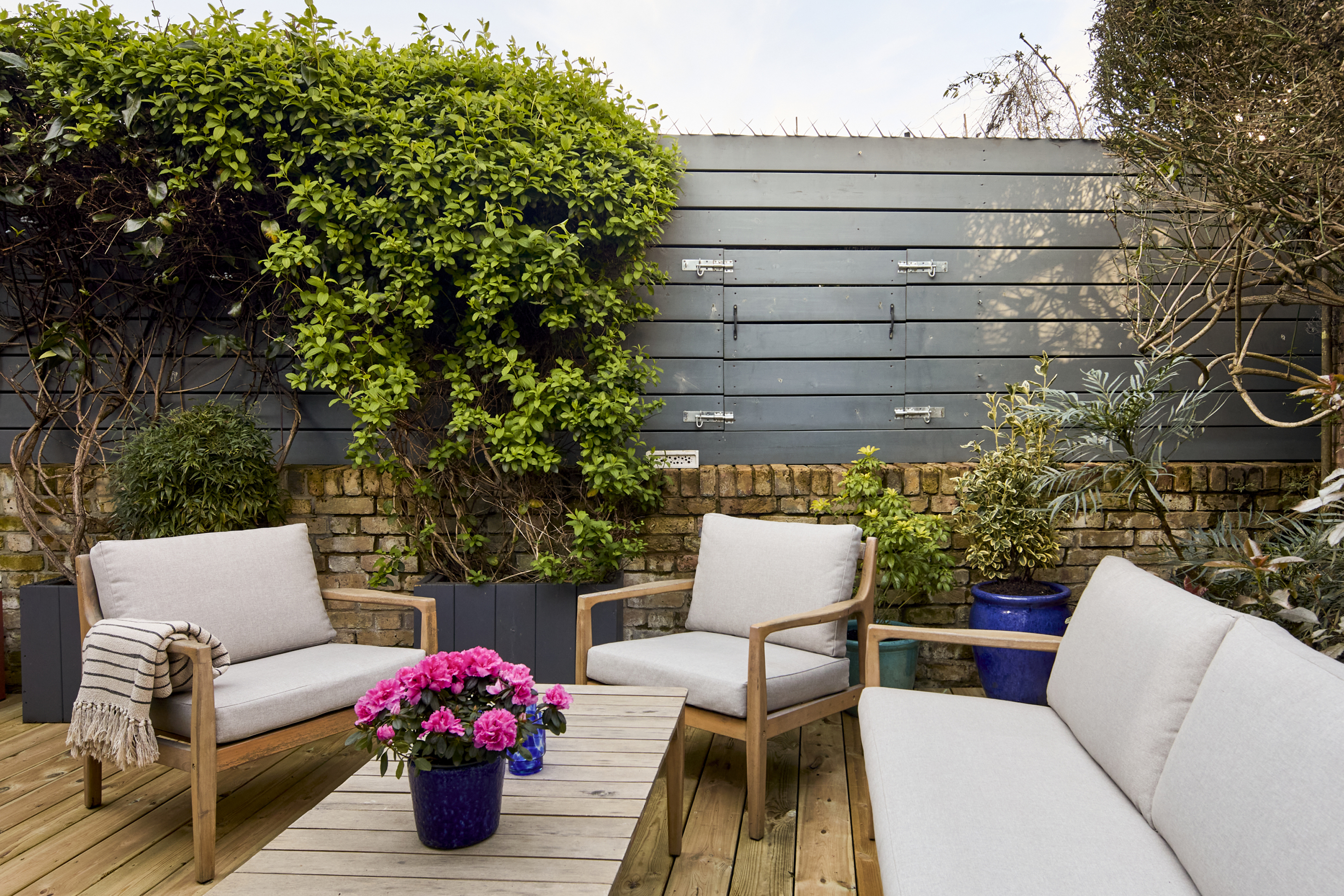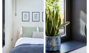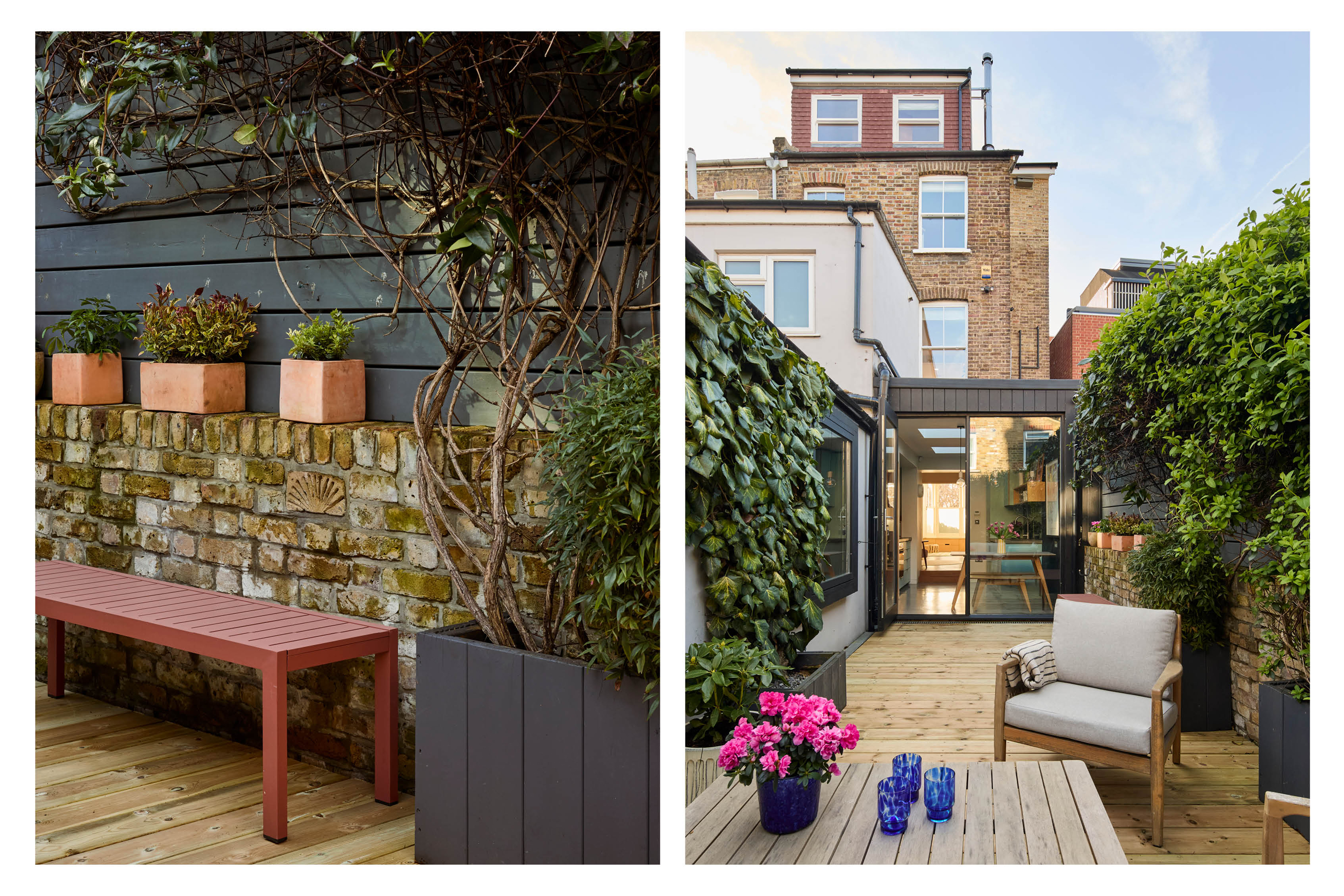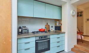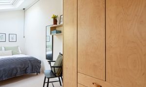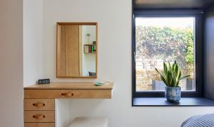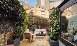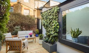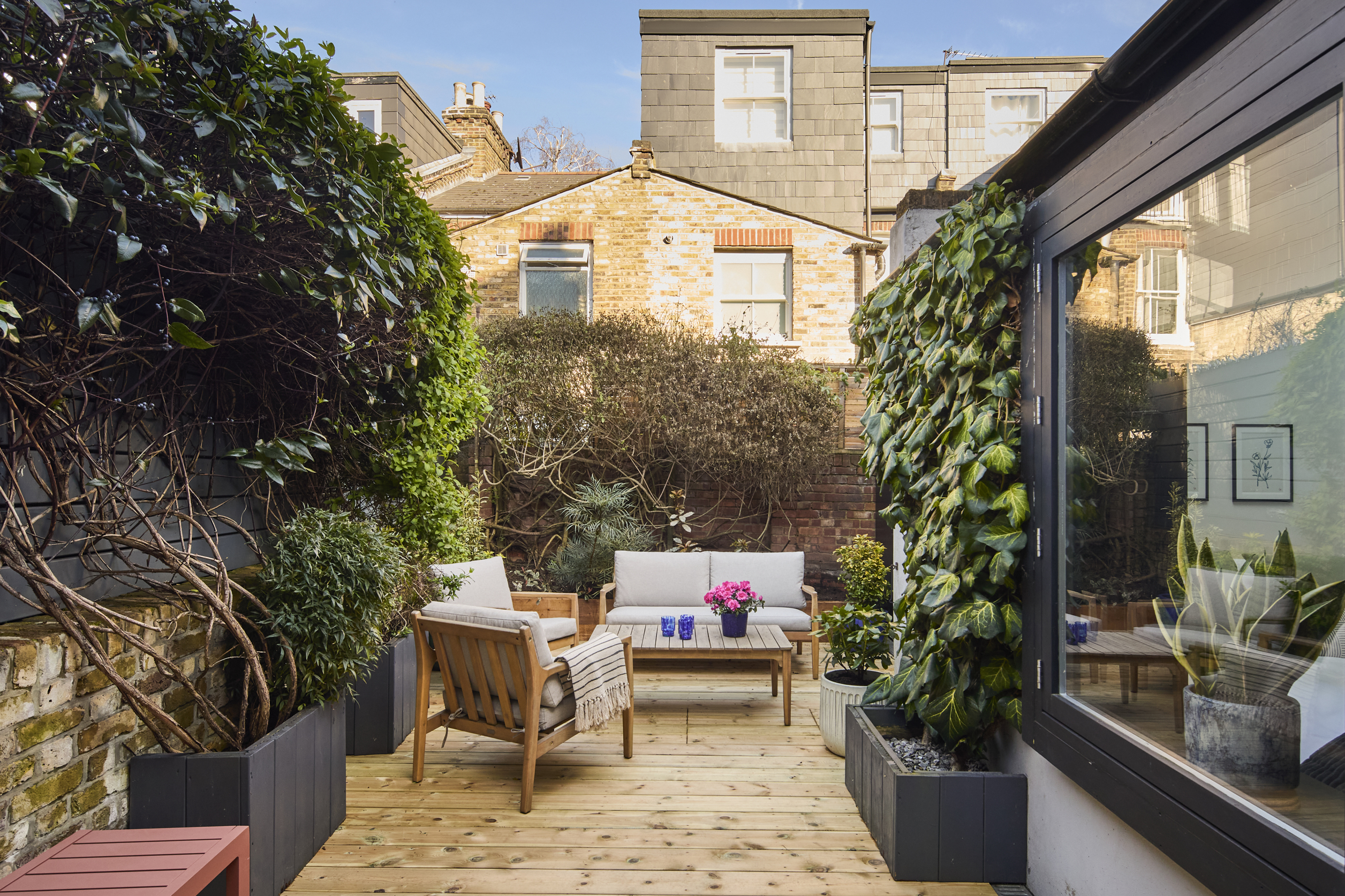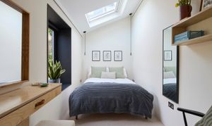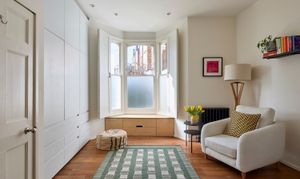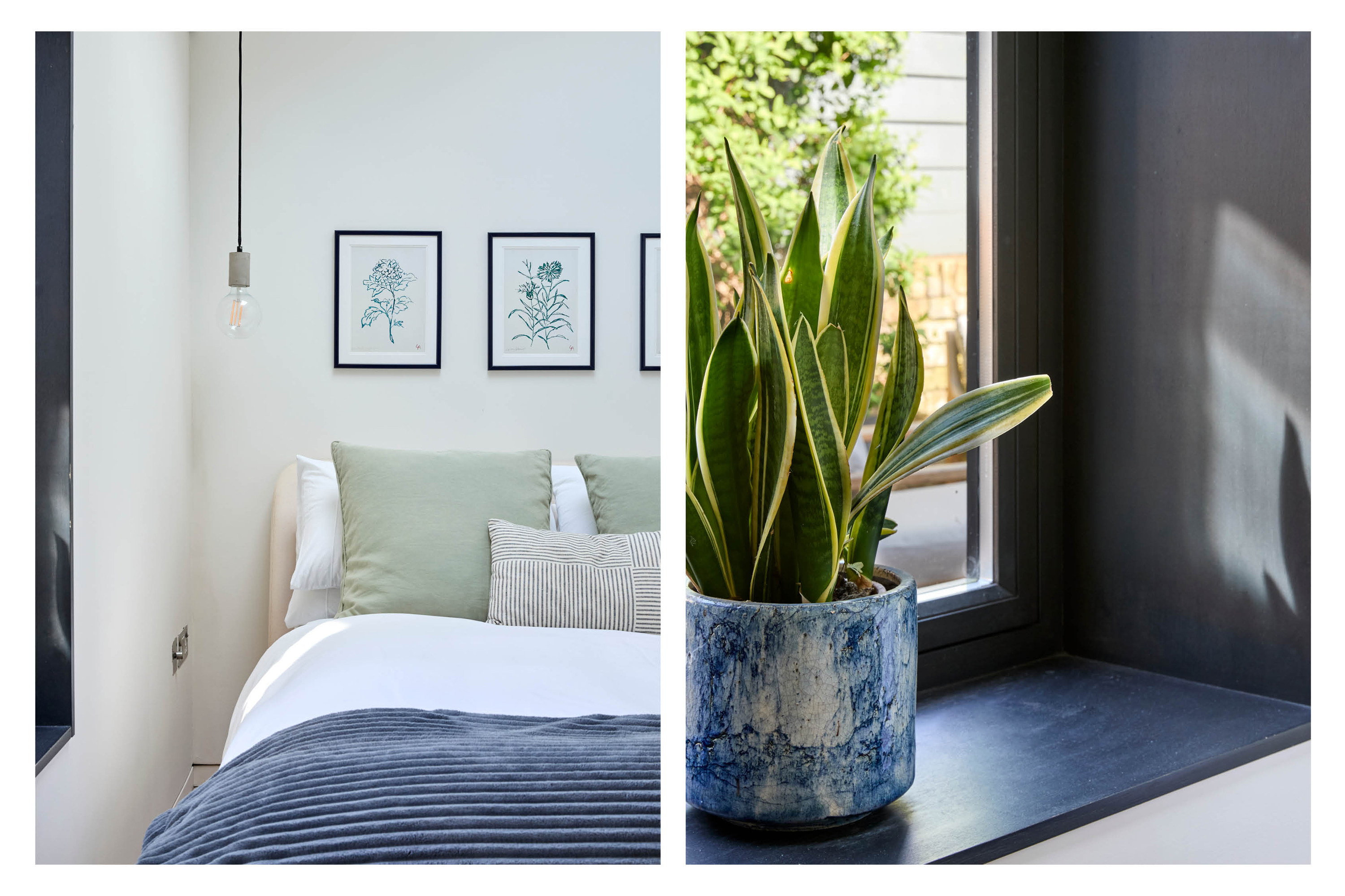 At the back, the kitchen opens onto the garden, creating a sense of flow between inside and out. Just beyond, the principal bedroom sits within a garden extension — providing a rare pocket of peace for London. Here, a picture window overlooks the greenery, bespoke joinery keeps everything streamlined, and a nearby bathroom completes the retreat-like feel. The garden itself is fully decked with thoughtful edge planting and, at the far end, there is a pint-sized studio — ideal for creative pursuits.
