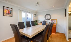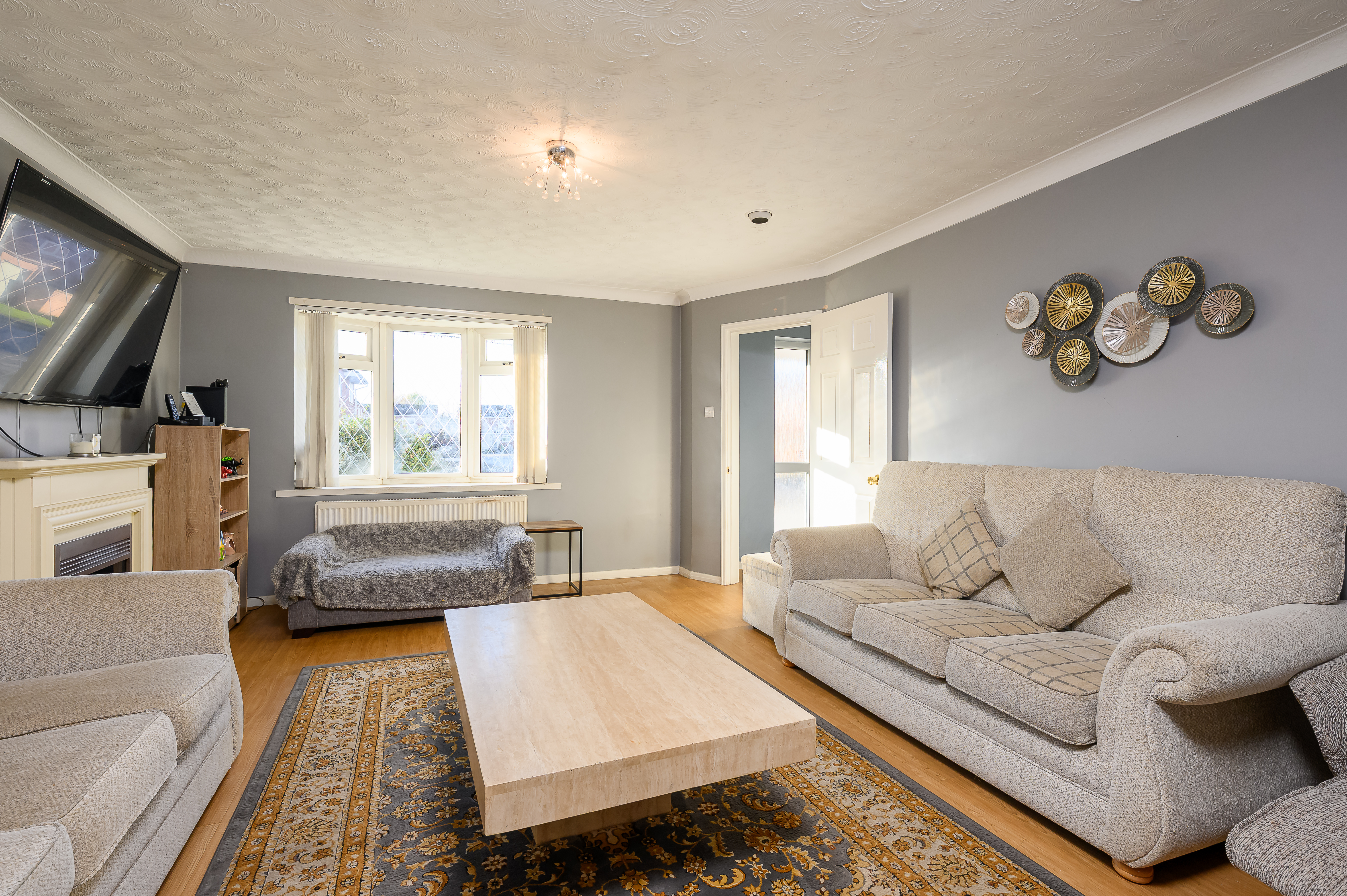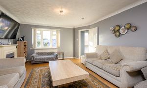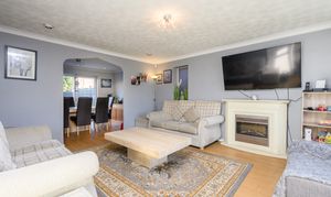 A further door from the kitchen opens into the formal dining room, a generous space perfect for entertaining, featuring sliding patio doors leading out to the rear garden. The dining room flows seamlessly into the living room, which benefits from a bay window to the front and an additional side window for extra natural light. An electric fireplace with a cream surround provides a charming focal point, with ample space for sofas and additional free standing furniture.