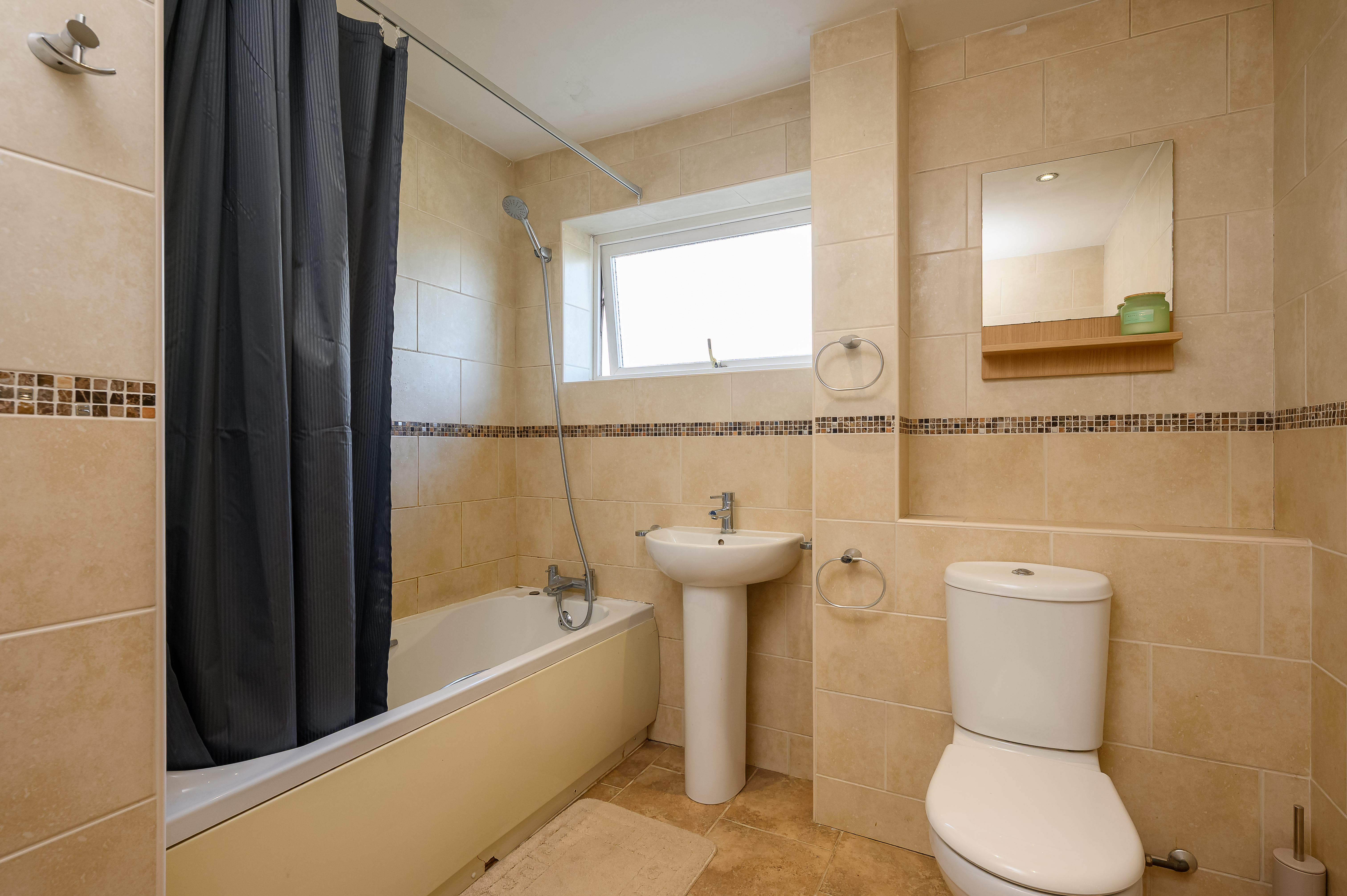 Bedrooms two, three, and four are all generous doubles, each with fitted bedroom furniture. The family bathroom comprises a bath with shower over, low-level WC, and pedestal sink, finished with stylish beige wall and floor tiles.