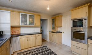 The spacious kitchen is fitted with light wood wall and base units, complemented by contrasting worktops. Integrated appliances include an eye-level microwave, electric oven, and gas hob with extractor fan above. A sink and drainer beneath a large rear window overlook the garden, while a door leads into a practical utility room with space for a washing machine and an American-style fridge freezer, as well as access to the rear garden.