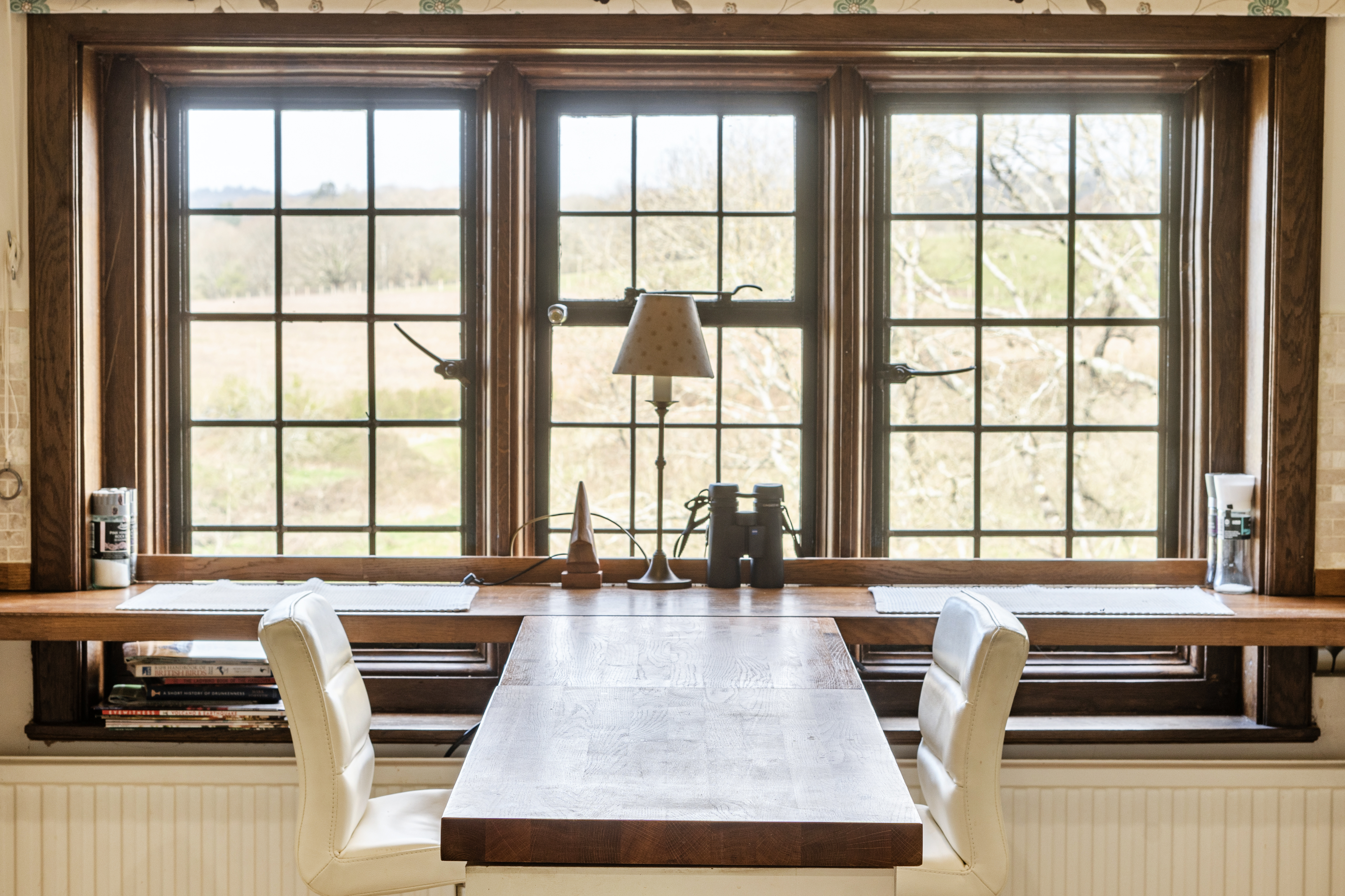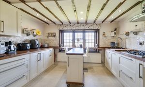 The principal bedroom suite, measuring 26’8, also benefits from a vaulted ceiling and exposed beams, while two additional bedrooms continue the home’s characterful appeal. The kitchen is well-equipped with a range of wall and base units, along with integrated appliances including a Neff five-ring hob, oven, grill, fridge, and dishwasher. A breakfast bar provides stunning views across the grounds, which can also be enjoyed from the study area within the impressive reception hall.