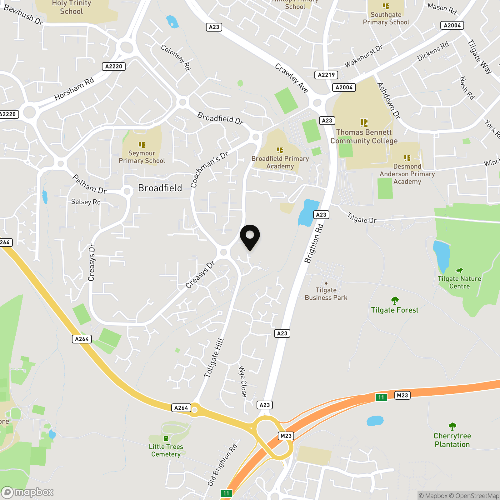 Located to the south west of the town, Broadfield has one of the largest neighbourhood shopping parades in the town with a wide variety of shops, a library, a church, a nearby mosque and a large medical centre. There are two primary schools, an adventure playground, many open spaces with football pitches and the Broadfield Stadium which is home to Crawley Town Football Club. Broadfield Park is next to the stadium, this used to be part of Tilgate Estate and there is a small lake and some woods. Buchan Country Park and Tilgate Park are roughly equidistant, both with large, open spaces to relax in and K2 Leisure centre is nearby. The 24 hour Fastway bus service connects Broadfield to Crawley town centre, Gatwick Airport and beyond and the A23 / M23 provides access to London and the south coast.