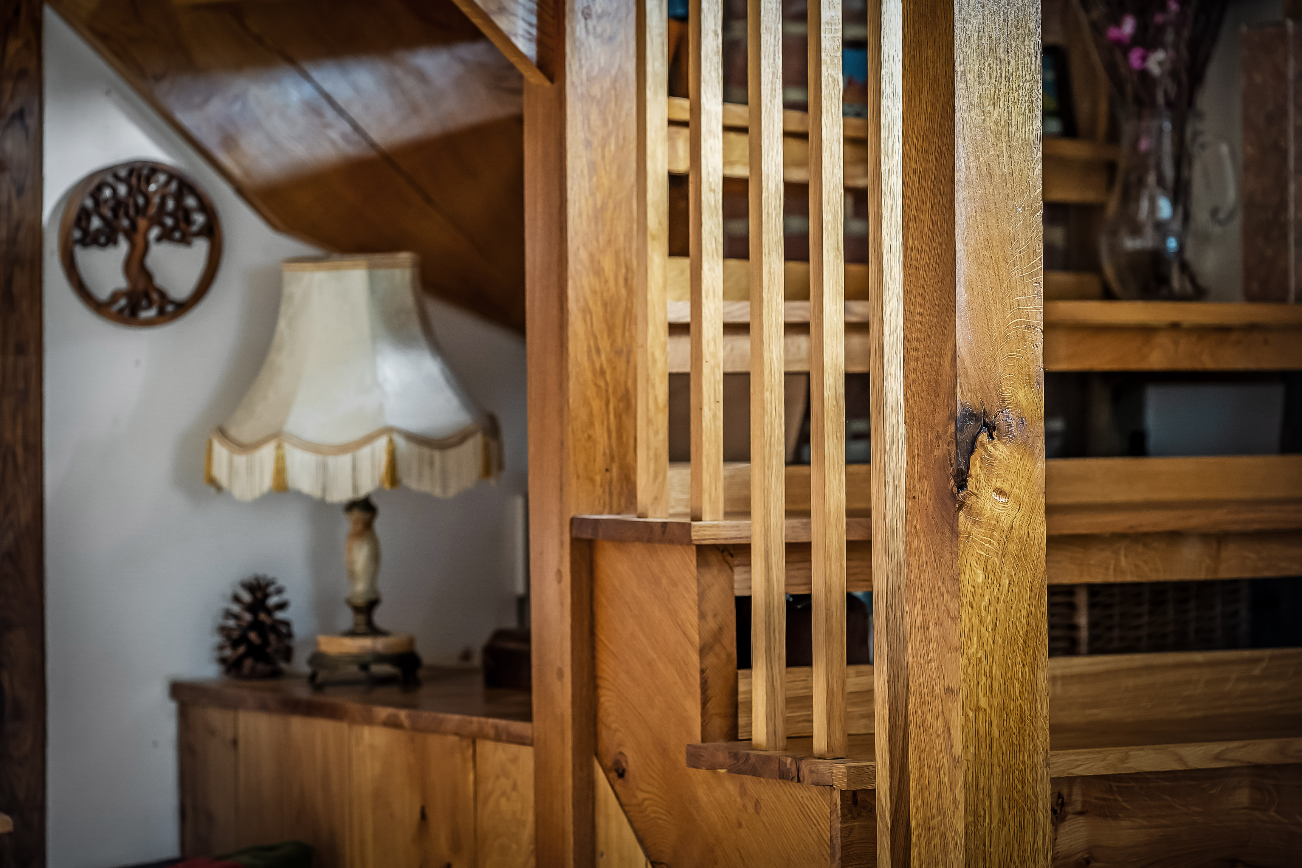 The ground floor is centred around a stunning kitchen/family room, forming an impressive and sociable heart of the home. Fitted with bespoke wooden cabinetry, a combination of solid oak and granite work surfaces, and space for a range cooker and American-style fridge/freezer, the kitchen effortlessly balances rustic charm with modern practicality. Underfloor heating runs throughout the ground floor, enhancing comfort and cohesion. From here, the accommodation flows into two remarkable roundel rooms: a characterful sitting room with access to the patio and a striking dining room, both offering unique curved walls and an atmospheric setting for everyday living and entertaining.