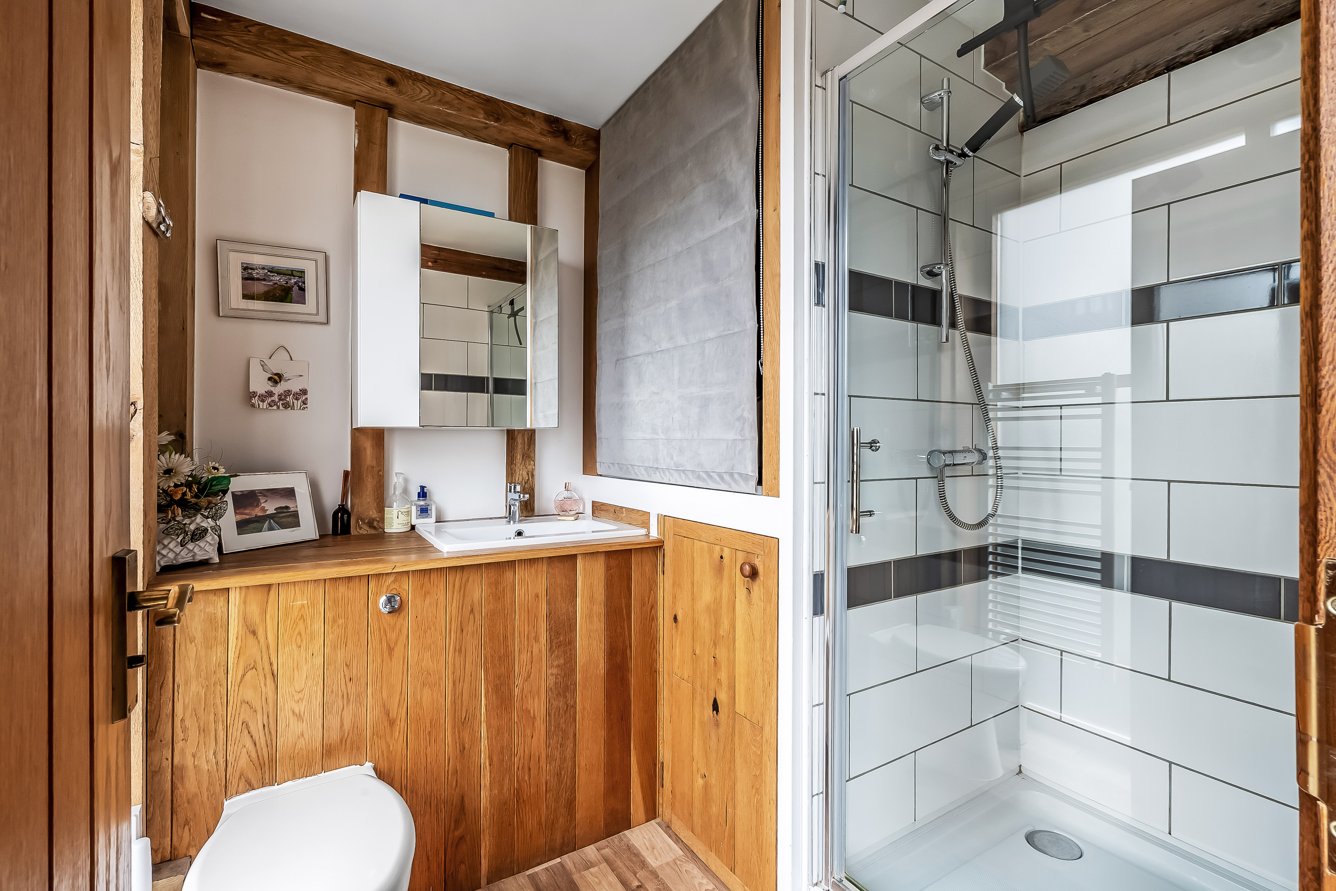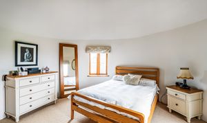 Upstairs, the sense of character continues. Two of the double bedrooms are positioned within the roundels, creating distinctive and memorable spaces with charming proportions and views across the surrounding countryside. A further double bedroom and an additional fourth bedroom or study provide flexible accommodation, ideal for families, guests or home working. A beautifully appointed family bathroom serves the first floor, complemented by a modern shower room on the ground floor.