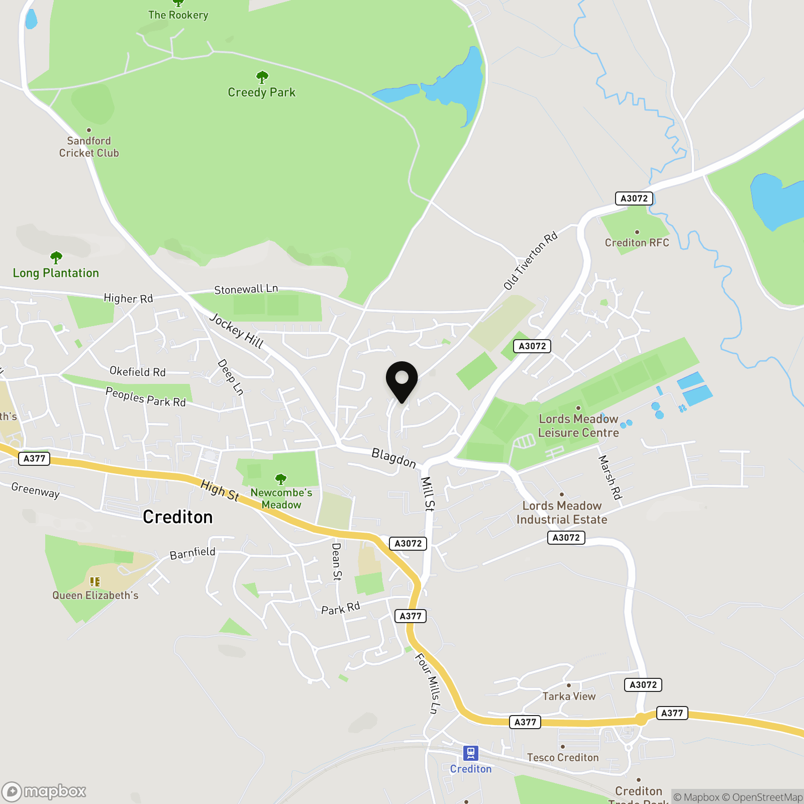 If in Crediton High Street, head towards Exeter and bear left after the parish church into East Steet. At the end, turn left into Mill Street and follow the road around the corner, go straight over the mini-roundabout and take the next left into Blagdon Close. Bear right and then first left into Creedy Road head to the end, bear right and the property will be found in the top left corner.