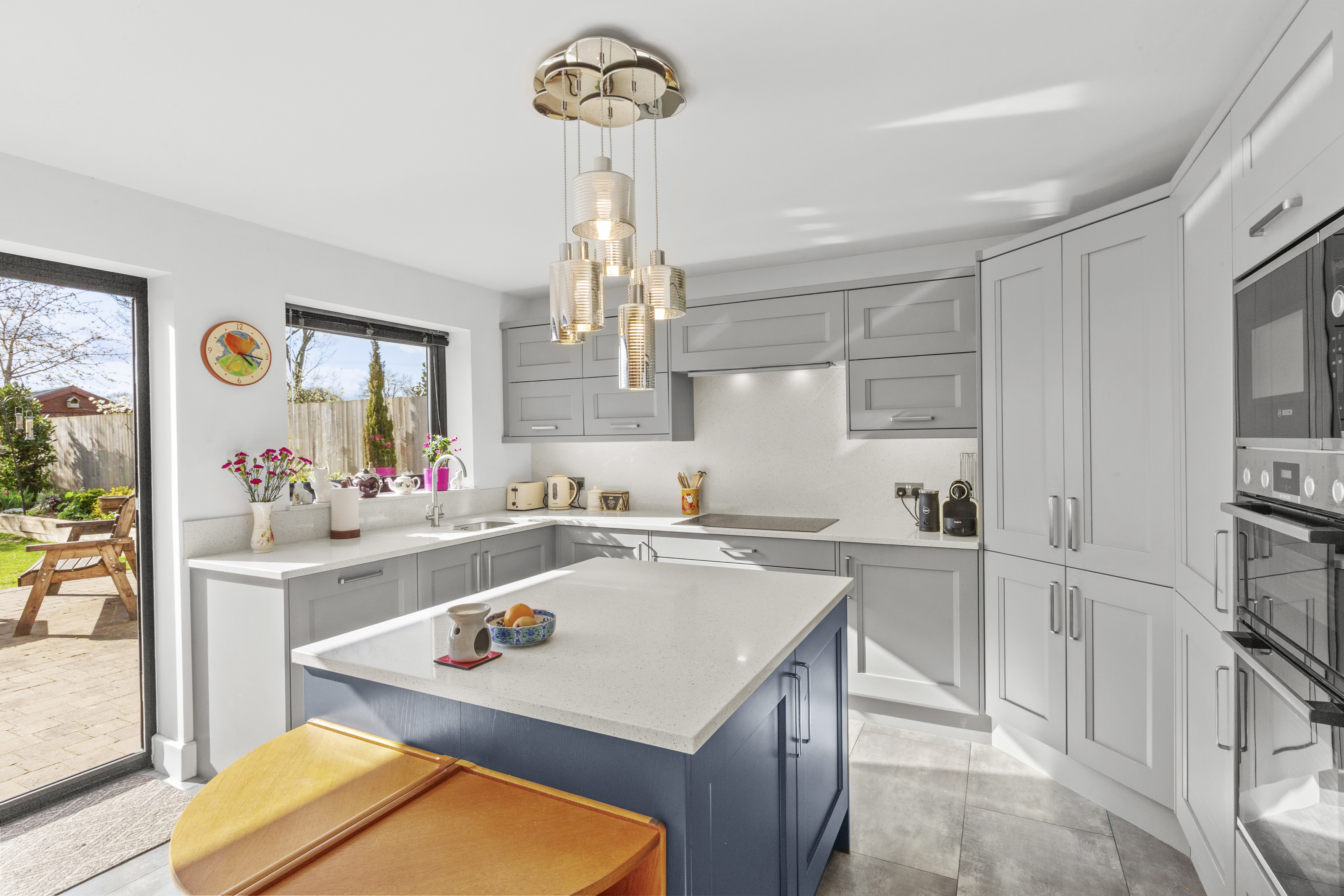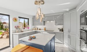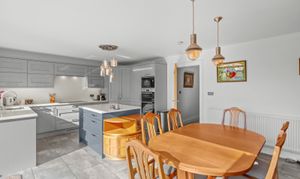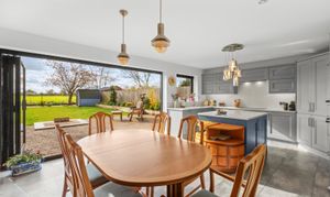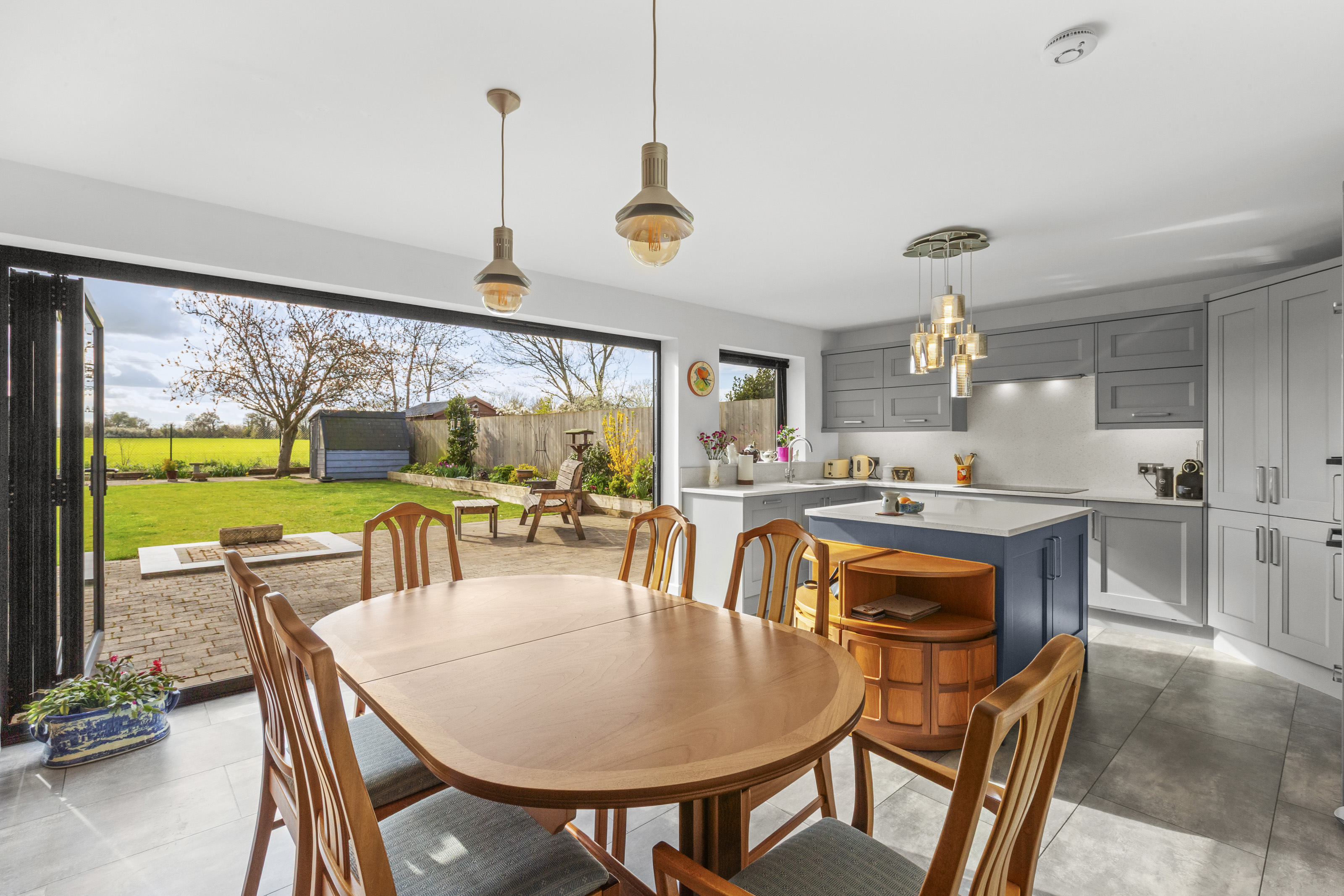 The property welcomes you via an inviting entrance, leading into a central hallway that provides access to all principal rooms. A particular highlight is the impressive kitchen/breakfast room, beautifully designed and featuring sleek bi-fold doors that open onto the garden, perfectly framing the far-reaching countryside views. The elegant sitting room is equally appealing, offering a bright and relaxing space with French doors opening out to the rear garden.