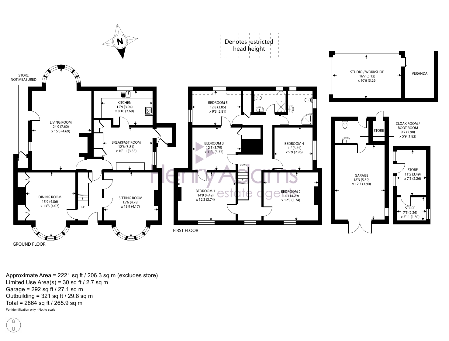 A detached garage with WC, store and utility room, and a separate workshop/shed. Utility room measures 3.47m x 2.25m