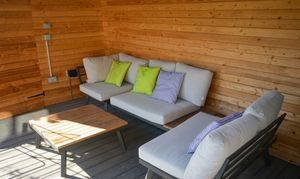 Large Gardens extend to the rear of the property with a covered Seating Area whilst to the front a driveway leads off the road to provide parking for 3 cars.