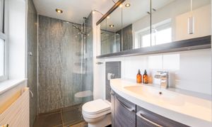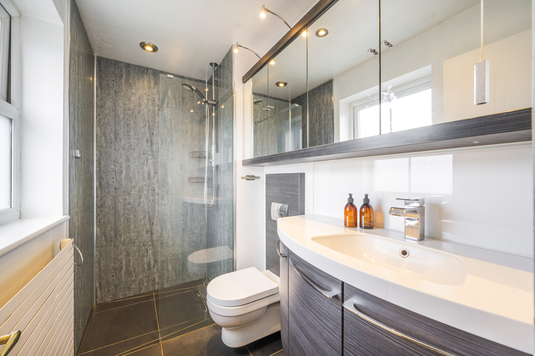 The adjoining wet room is finished in a striking monochrome style, featuring sleek matt black, grey and white tones for a sharp, contemporary feel. Complete with a double mirror cabinet and modern fittings, it provides a stylish and practical space—perfect for a refreshing start or end to the day.