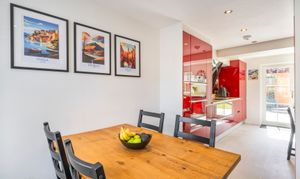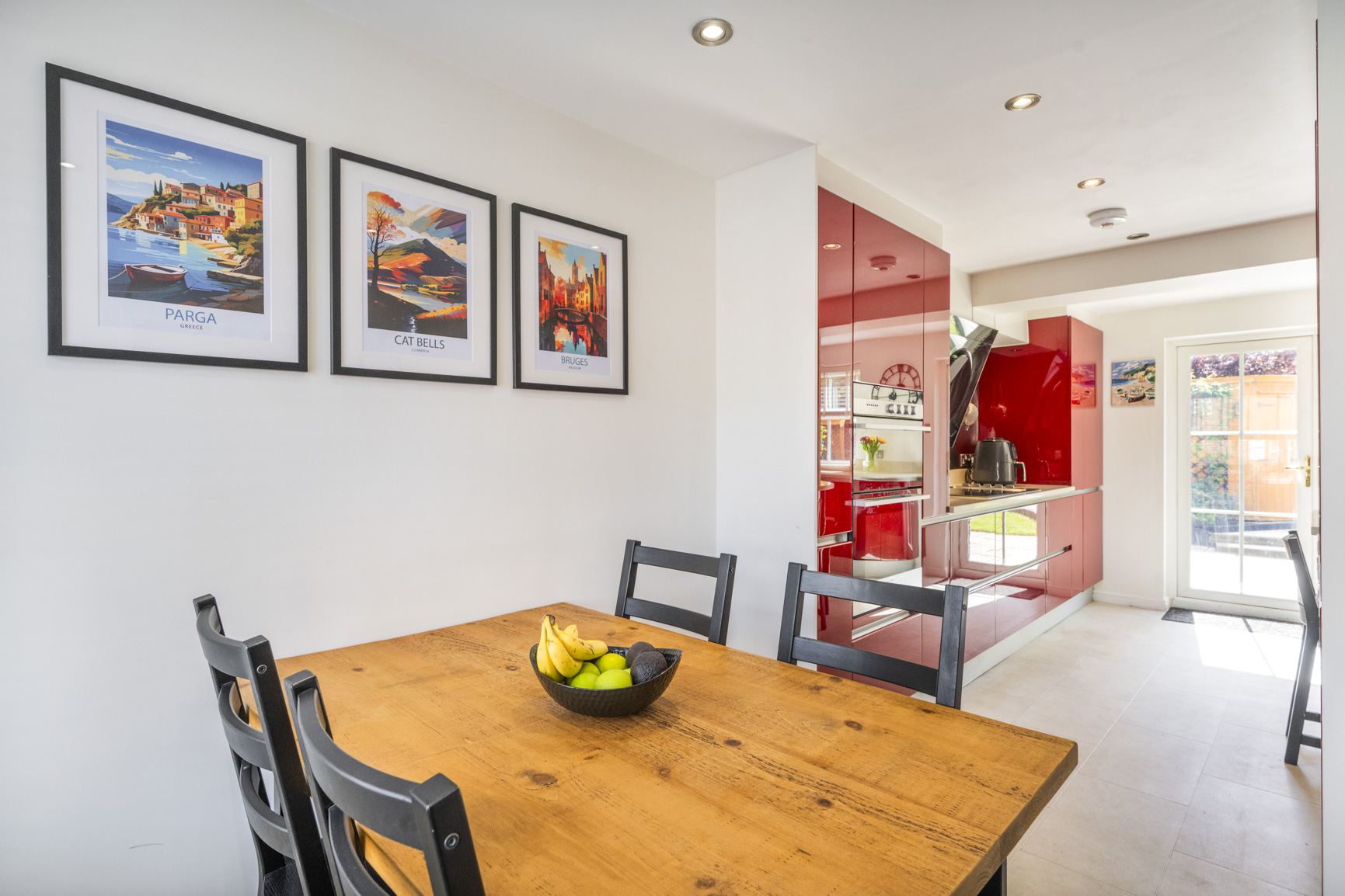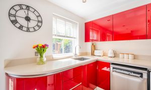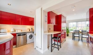 A striking, contemporary kitchen designed to impress, featuring a bold red, black and white colour palette that creates a vibrant, high-energy space at the heart of the home. Perfect for both entertaining and everyday family life, this modern showstopper offers an impressive double oven, stylish extractor, and an inset sink positioned to enjoy views over the garden. A breakfast bar provides a relaxed spot to sit and unwind while cooking, making it an ideal social hub—perfect for everything from a quiet glass of wine to lively family baking moments. Thoughtfully arranged worktops wrap around the room, leading to a glazed rear door that fills the space with natural light, enhancing its bright and welcoming feel.