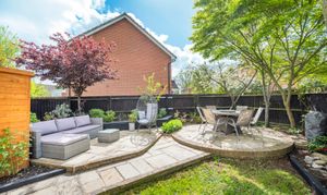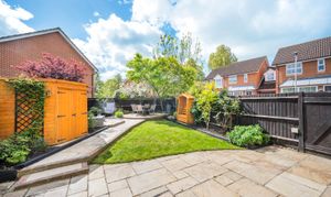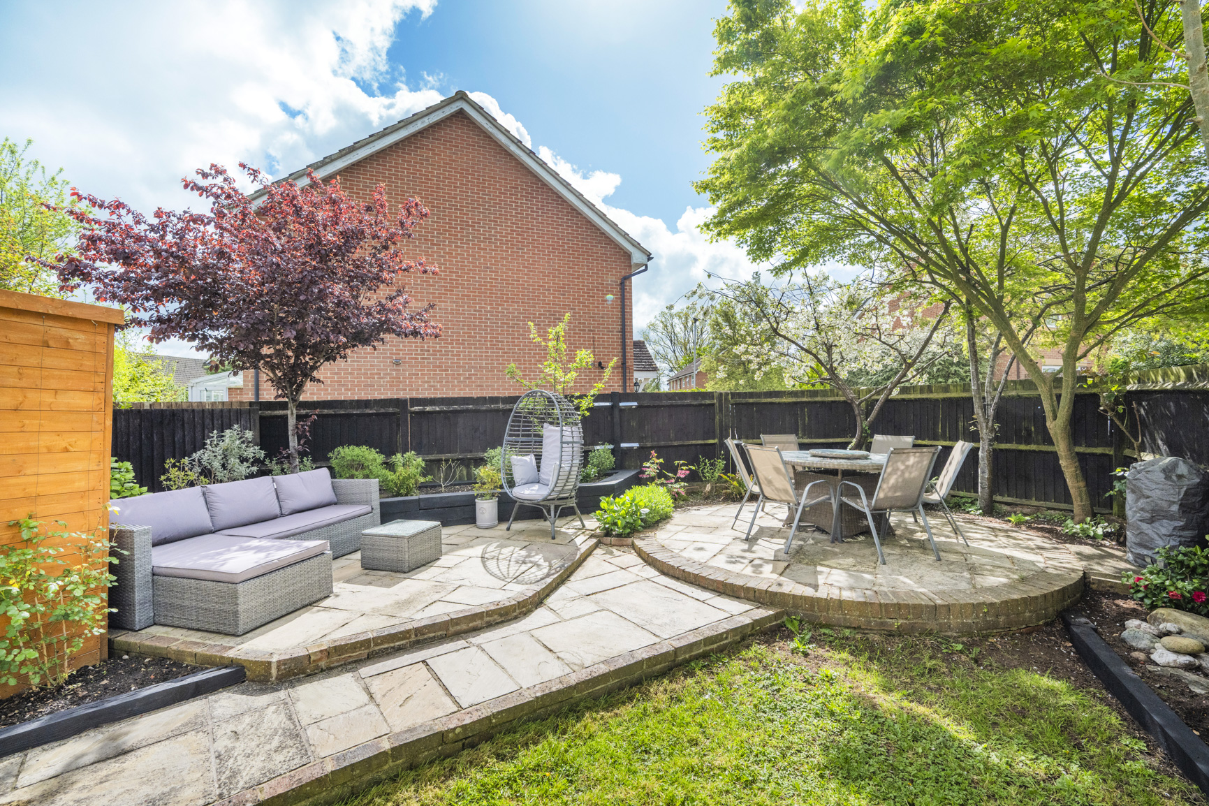 The landscaped rear garden offers a wonderful outdoor retreat, enjoying a southerly aspect that provides a bright and sunny setting throughout the day. It features a well-maintained lawn and an attractive patio area—perfect for al fresco dining and entertaining. A pathway leads to a second terrace, creating additional seating space, while mature shrubs set within planted beds add colour and privacy. The garden’s position enhances its sense of space, with a charming circular plateau area and a dappled tree providing natural shade to the upper terrace. A useful side shed offers storage for garden furniture, cushions and umbrellas, and side gate access adds further convenience.