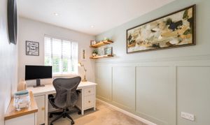 Currently utilised as a home office, this versatile room benefits from garden views and a light green panelled feature wall that brings a fresh, bright and stylish feel to the room.