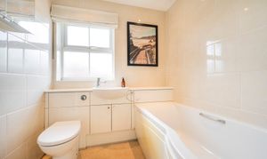 Finished in soft white and cream tones, the family bathroom offers a timeless and neutral backdrop—ideal for adding your own personal style. It features a P-shaped bath with shower over and fitted cabinetry, combining comfort with practical storage solutions.